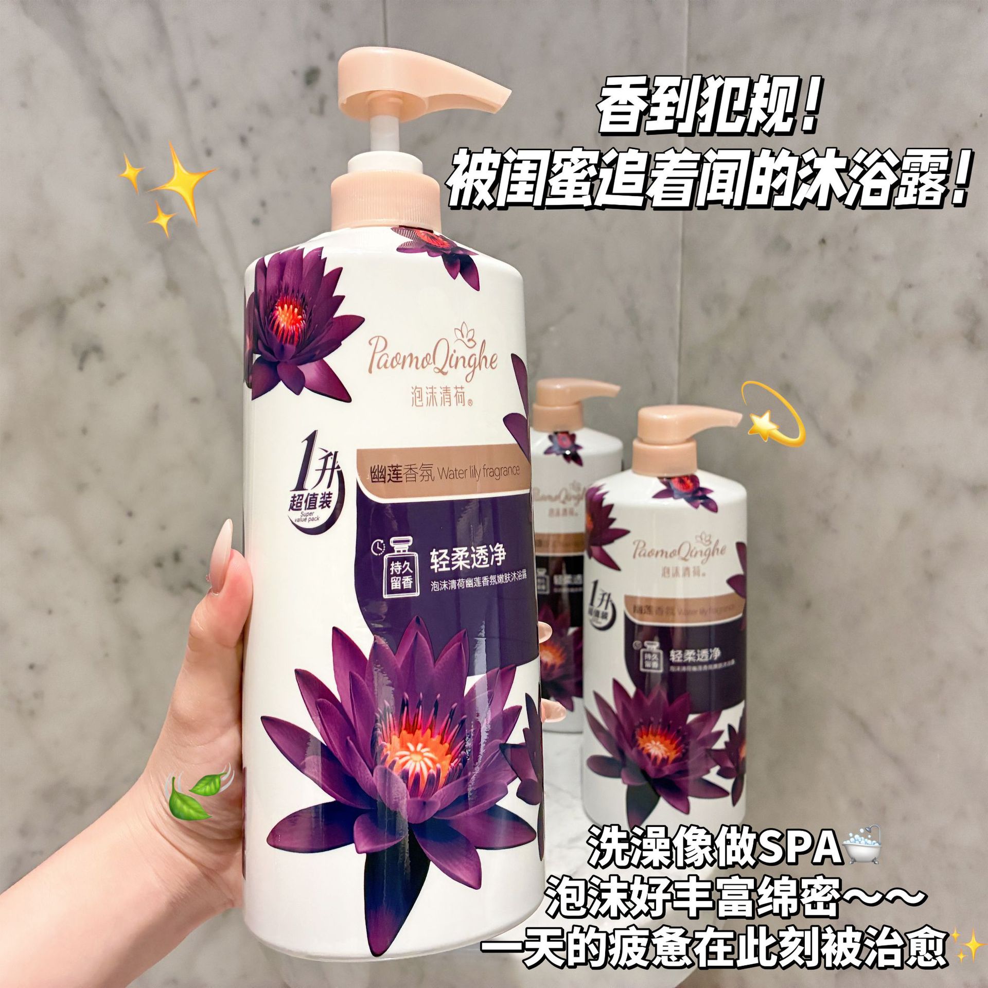 卸売および小売シャワージェル大容量パープルロータスチャームスキンシャワージェルロータス1Lロングラスティングフレグランスシャワージェル
