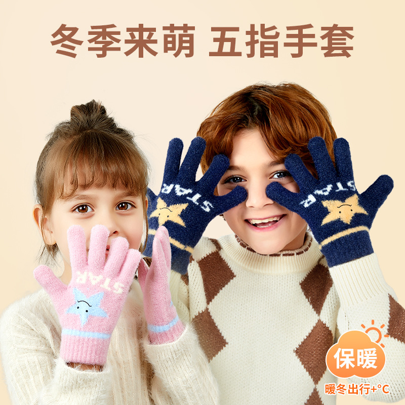 冬季儿童手套男针织毛线五指女孩小学生防寒保暖可爱卡通星星手套