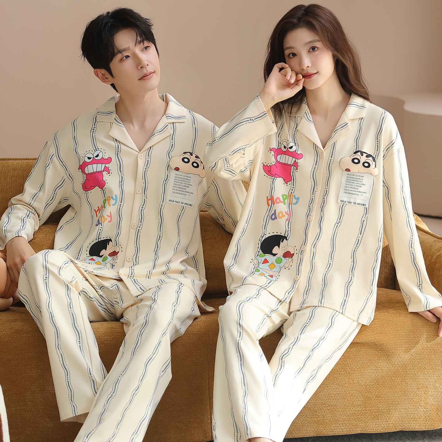 可爱蜡笔小新纯棉情侣睡衣春秋开衫翻领长袖长裤潮牌家居服套装