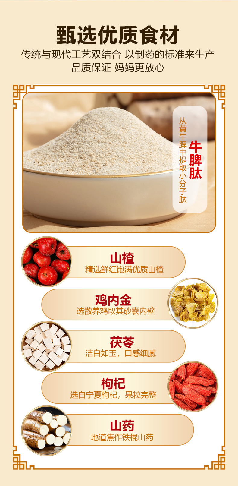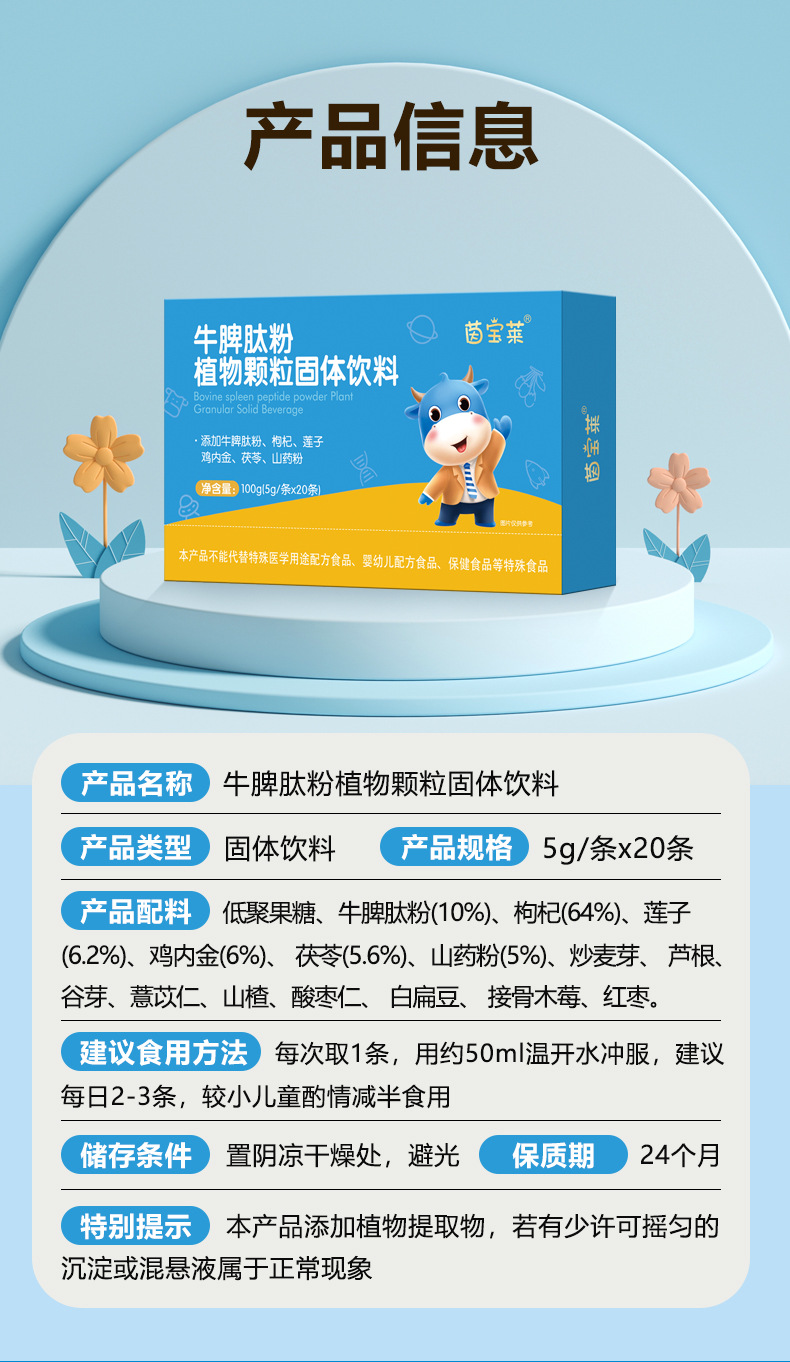 主な原料 オリゴフルクトース、ウシ脾臓ペプチド粉(10%) クコ (6.4%) 蓮子 (6.2%) 鶏内金(6%)茯苓(56%)山薬粉など