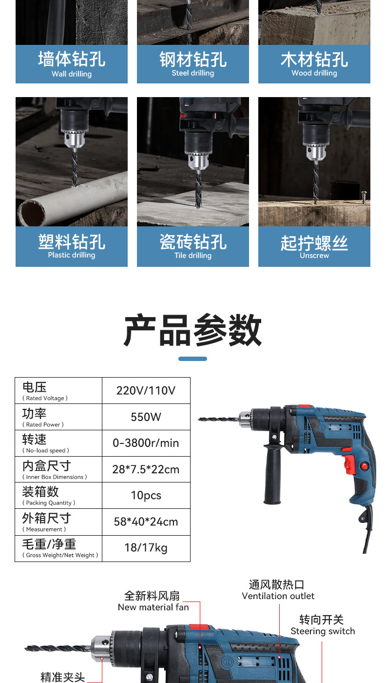 メーカー直供電動工具多機能インパクトドリルセット工具家庭用速度調整可能ハンドドリル
