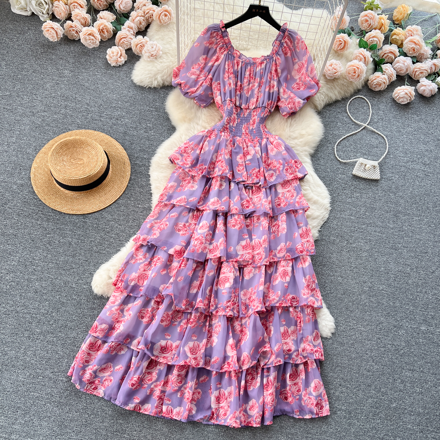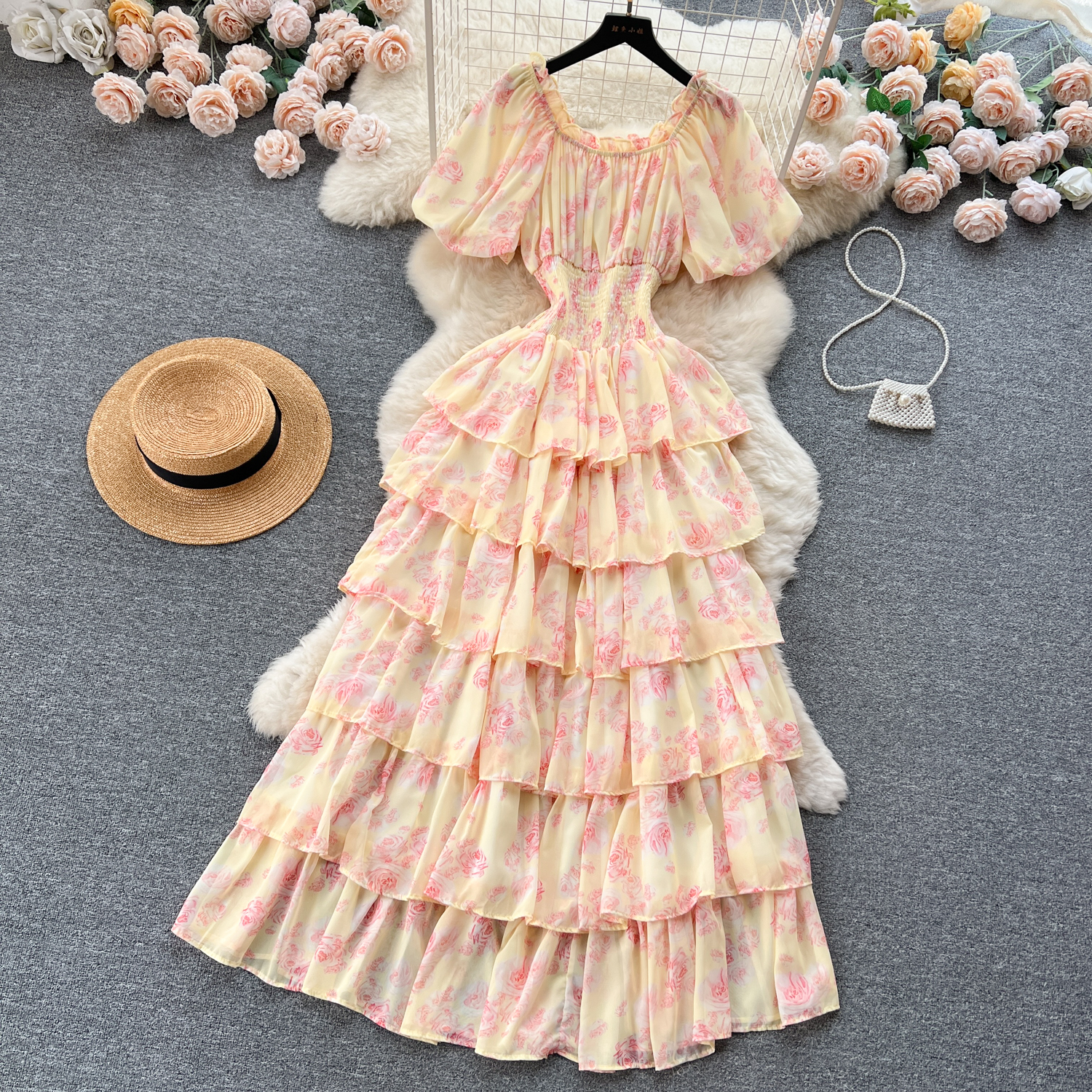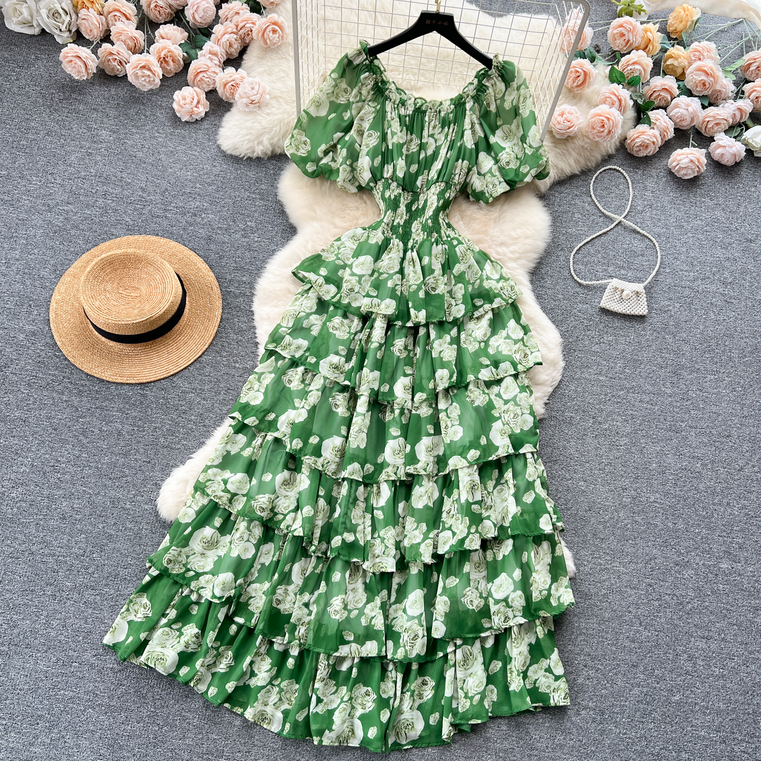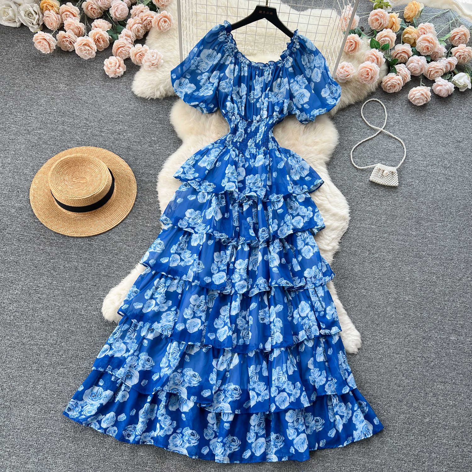 フランスのロマンチックな雰囲気感の花のワンピースの女性の夏の泡の袖の不規則な設計の小さい大衆の軽い豪華な魚の尾のロングスカート