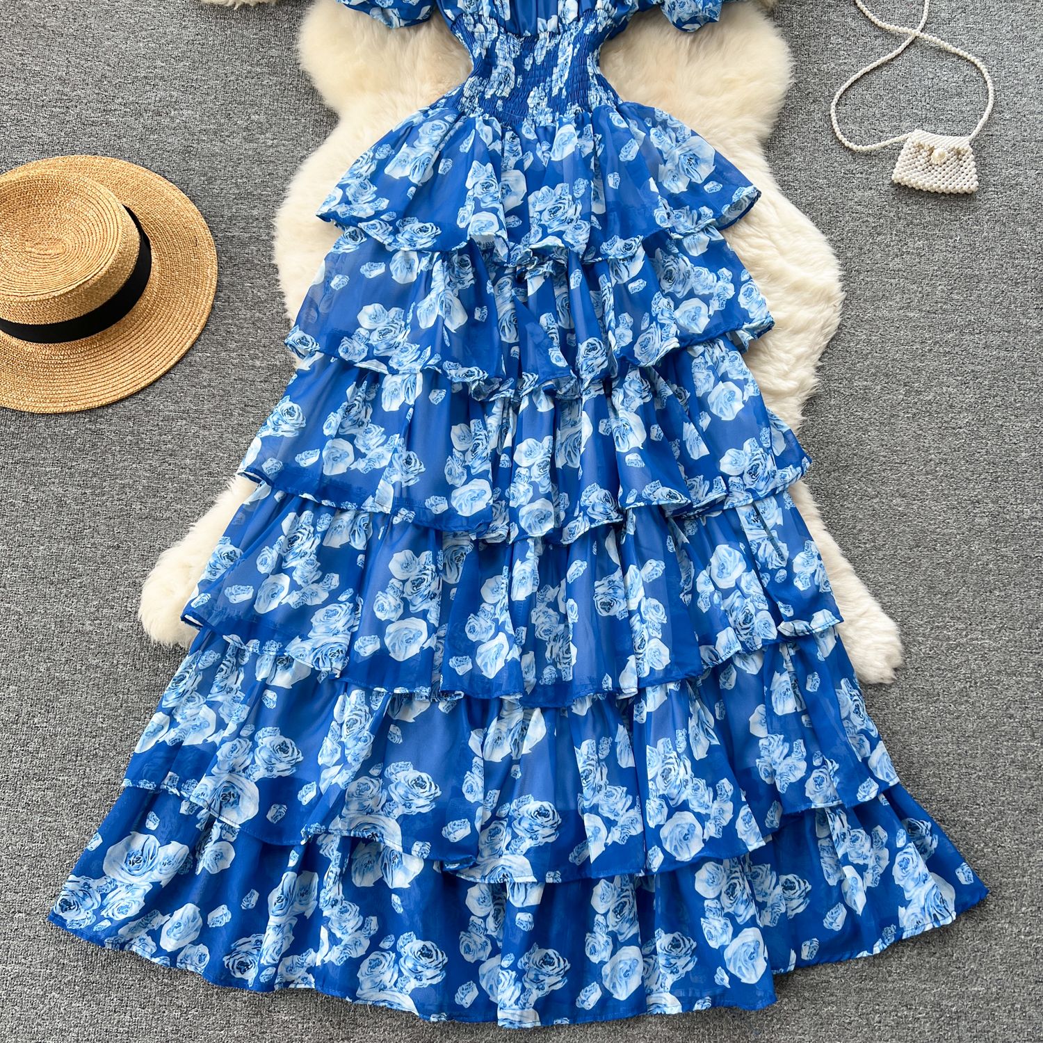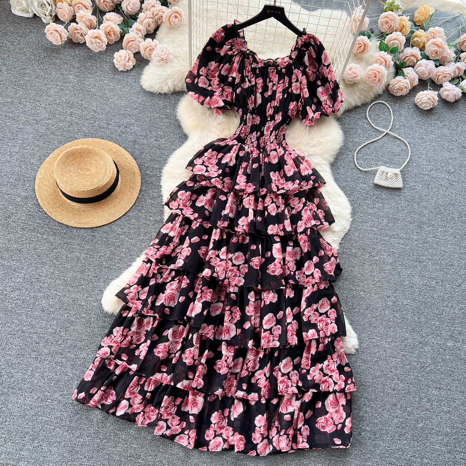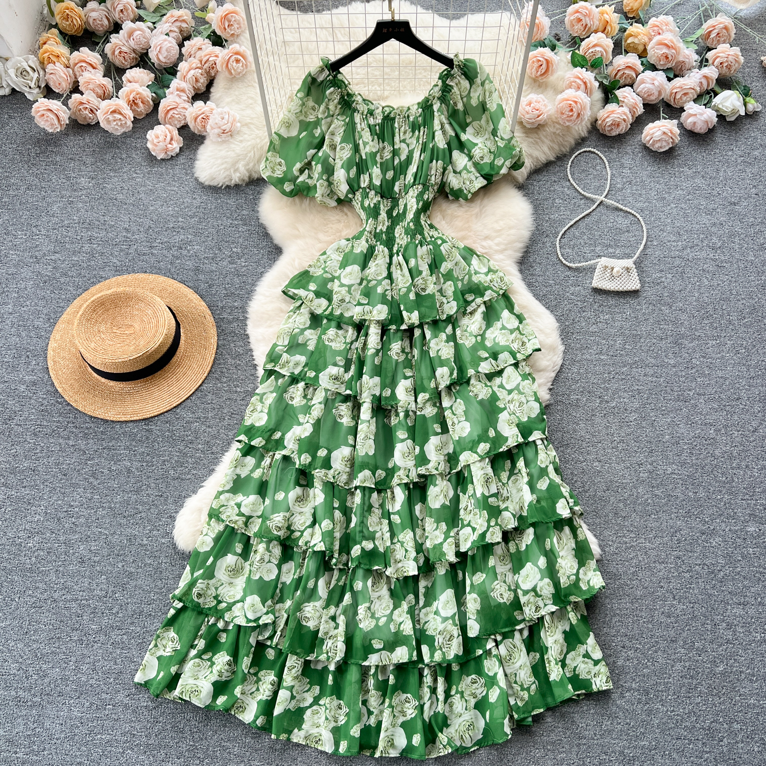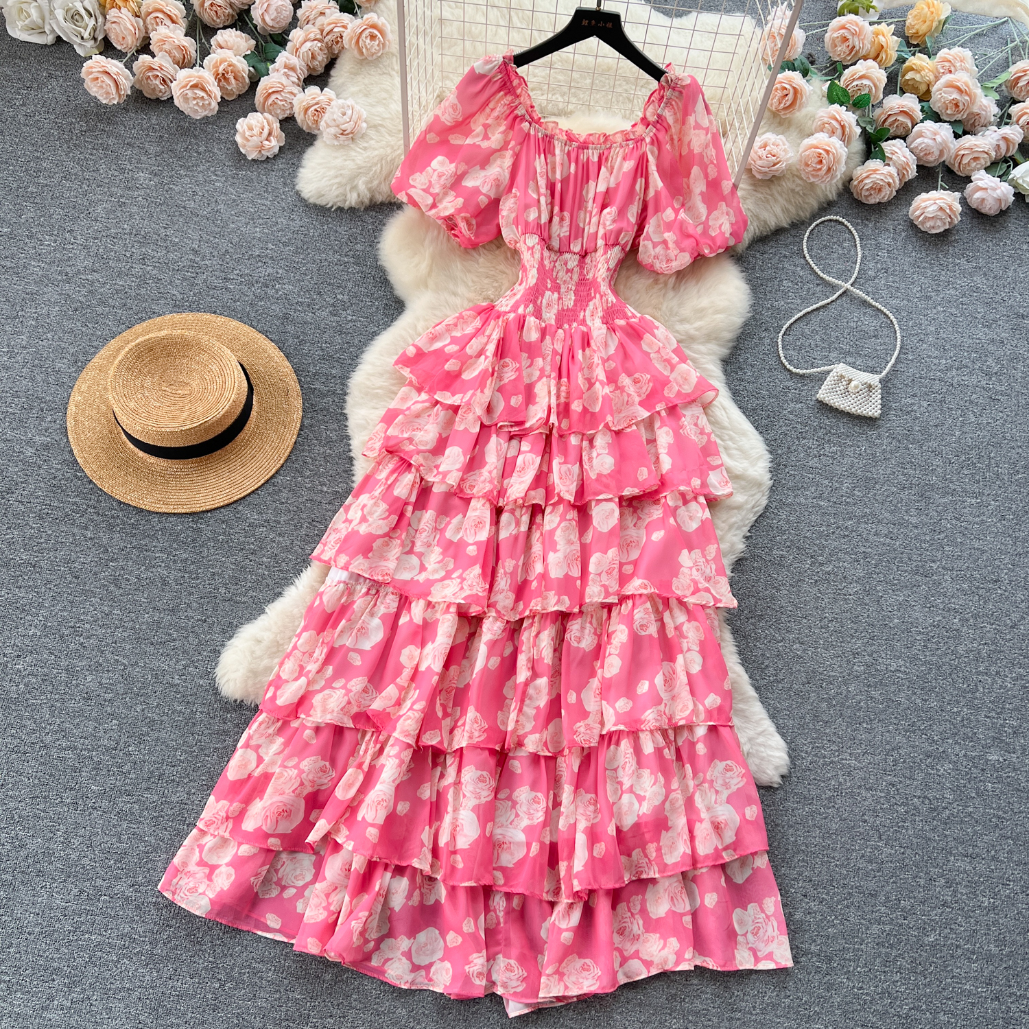 フランスのロマンチックな雰囲気感の花のワンピースの女性の夏の泡の袖の不規則な設計の小さい大衆の軽い豪華な魚の尾のロングスカート