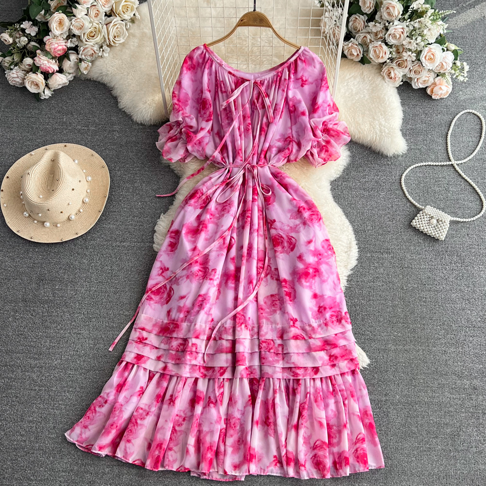 レトロな花のシフォンのワンピースの女性の夏の新型の泡の半袖は腰を収めてやせている休暇の高級感のケーキのスカートを現します。