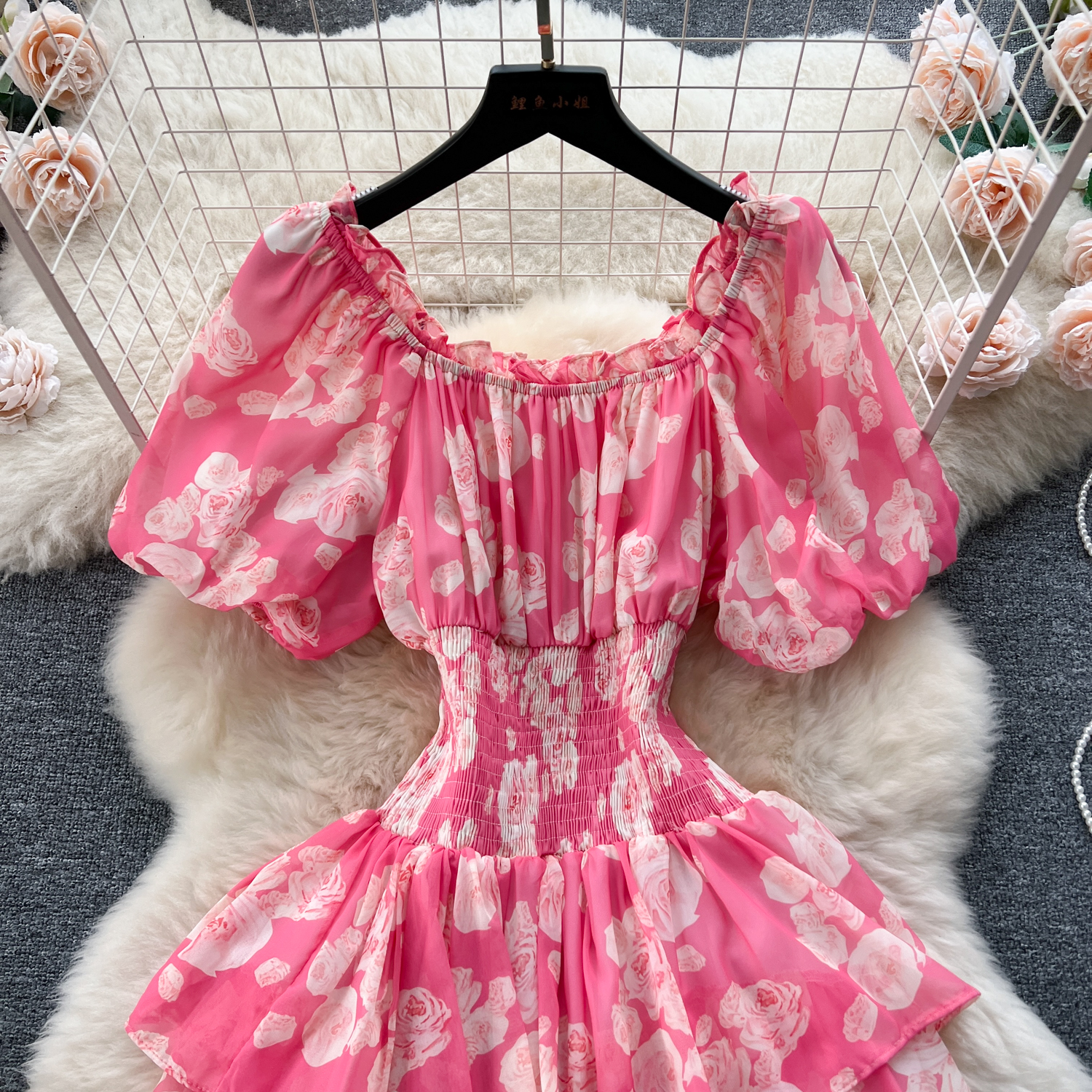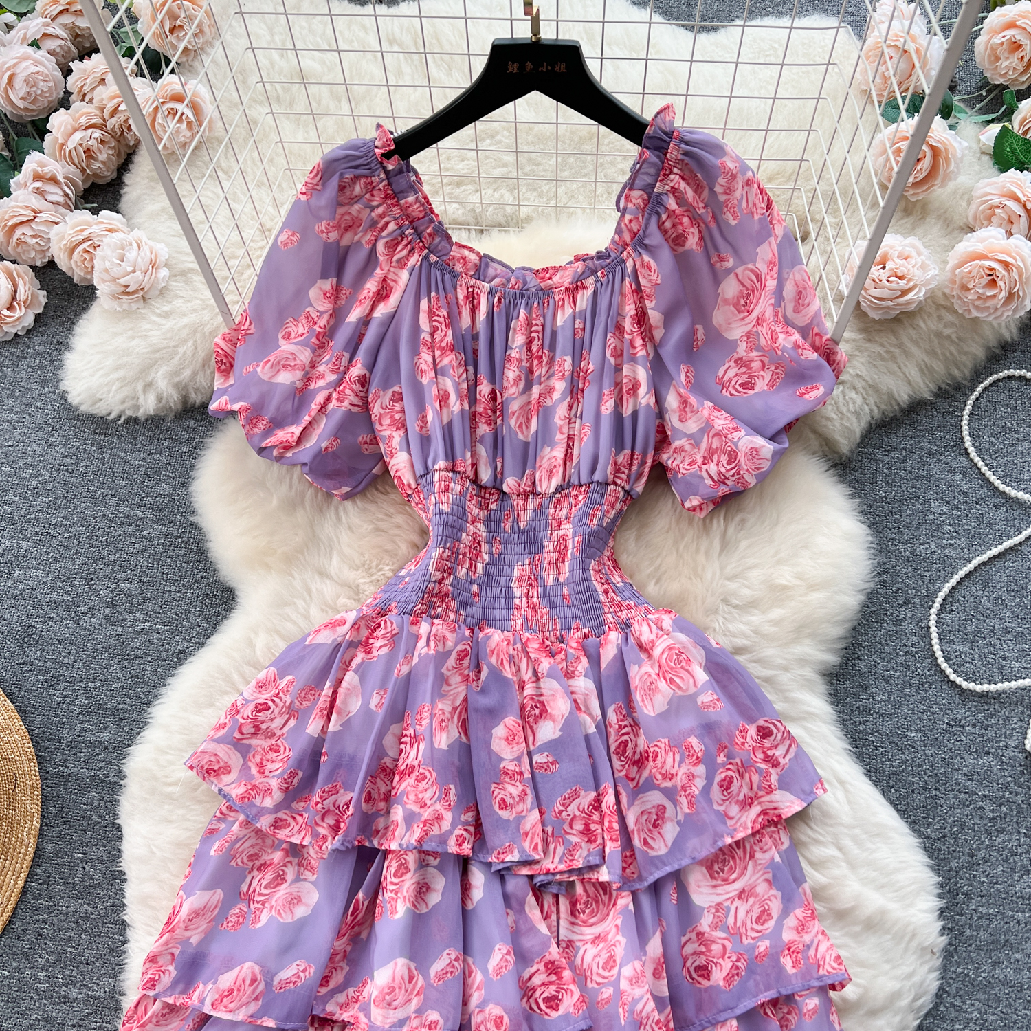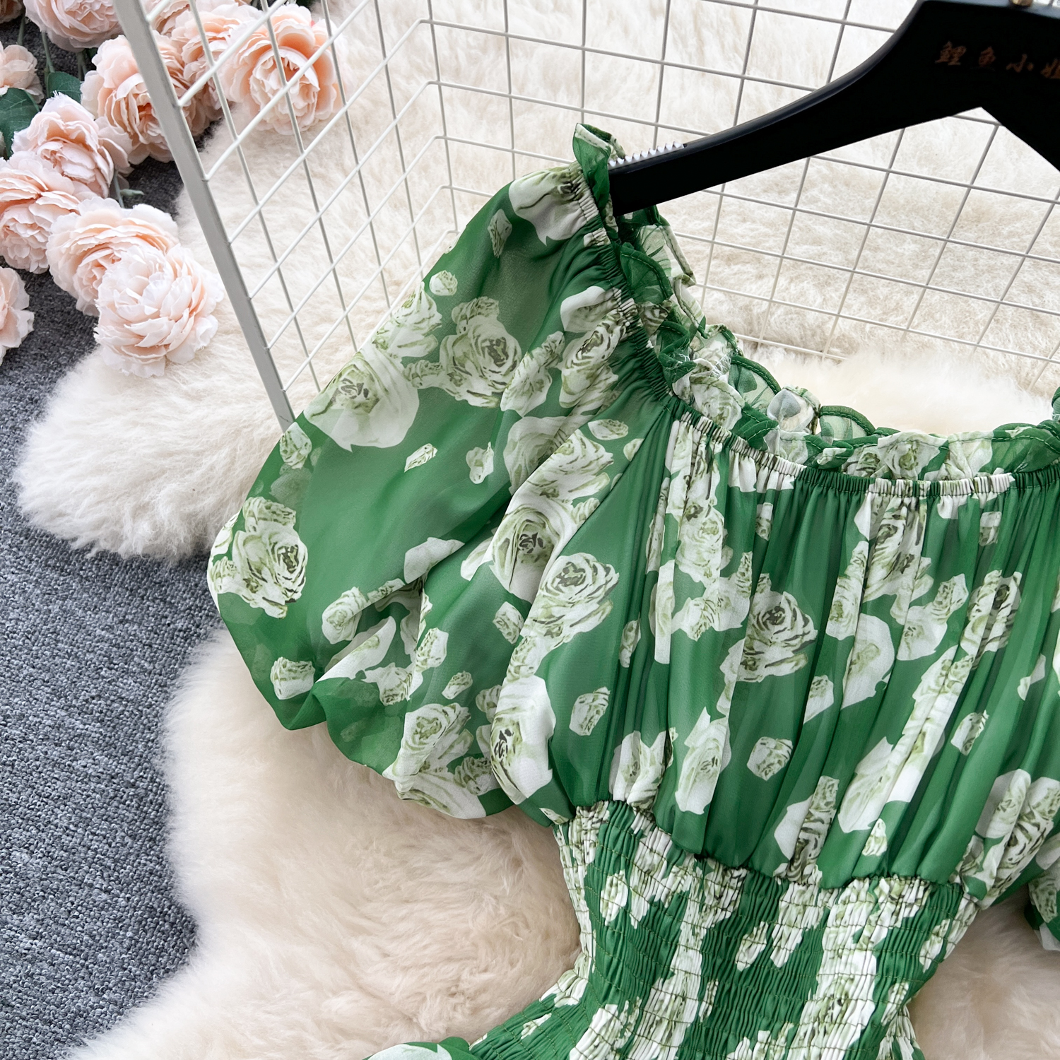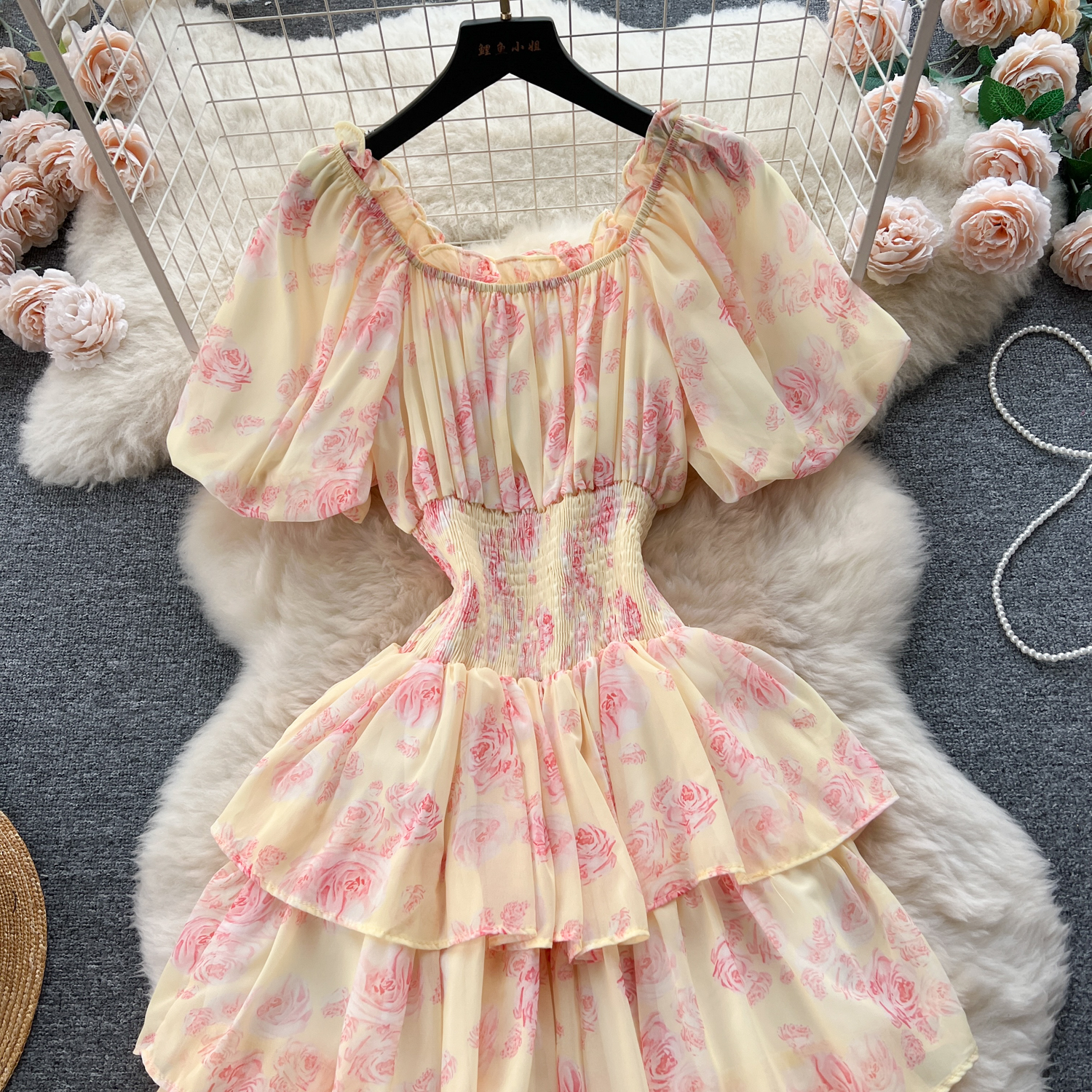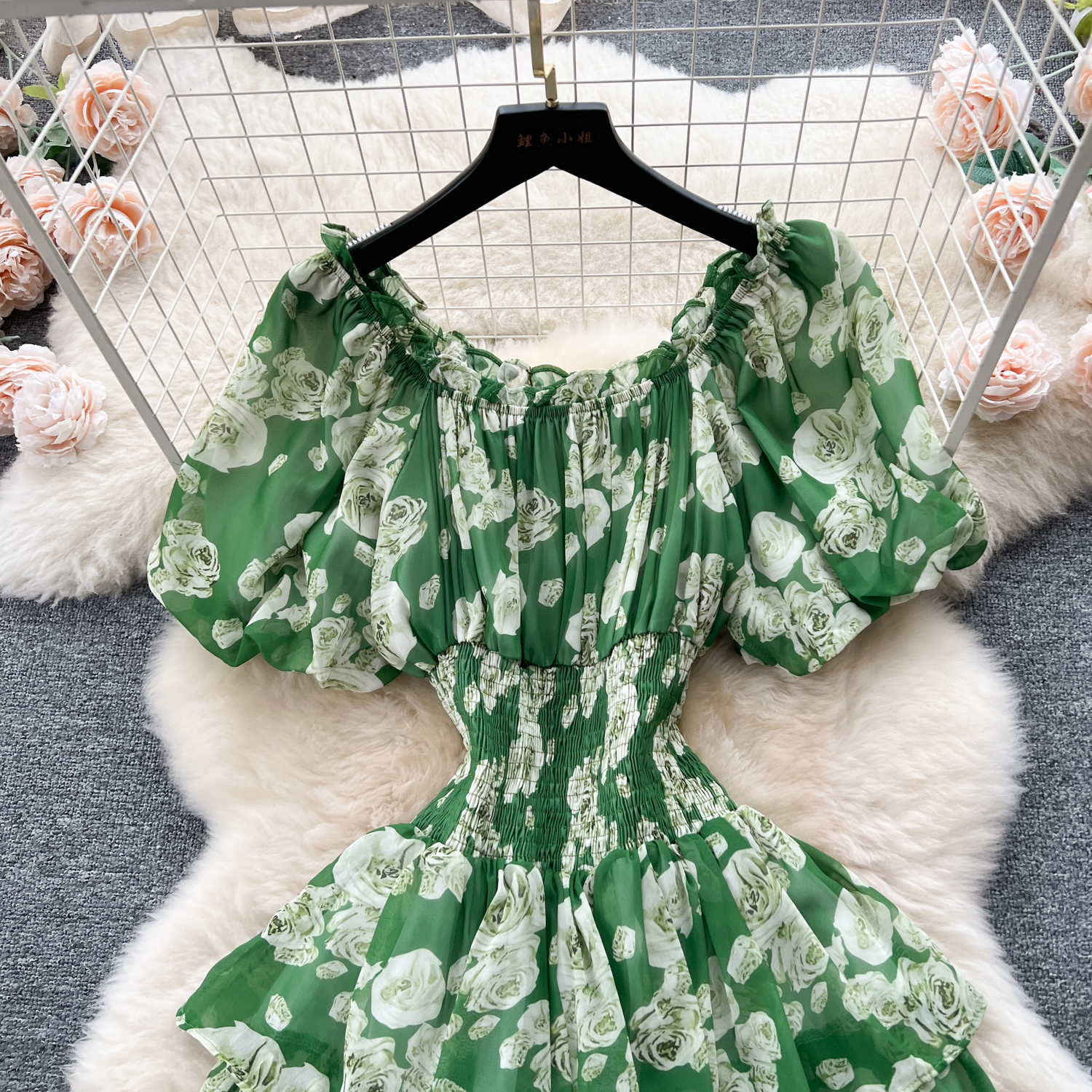 フランスのレトロで優しい風のシワの花のワンピース