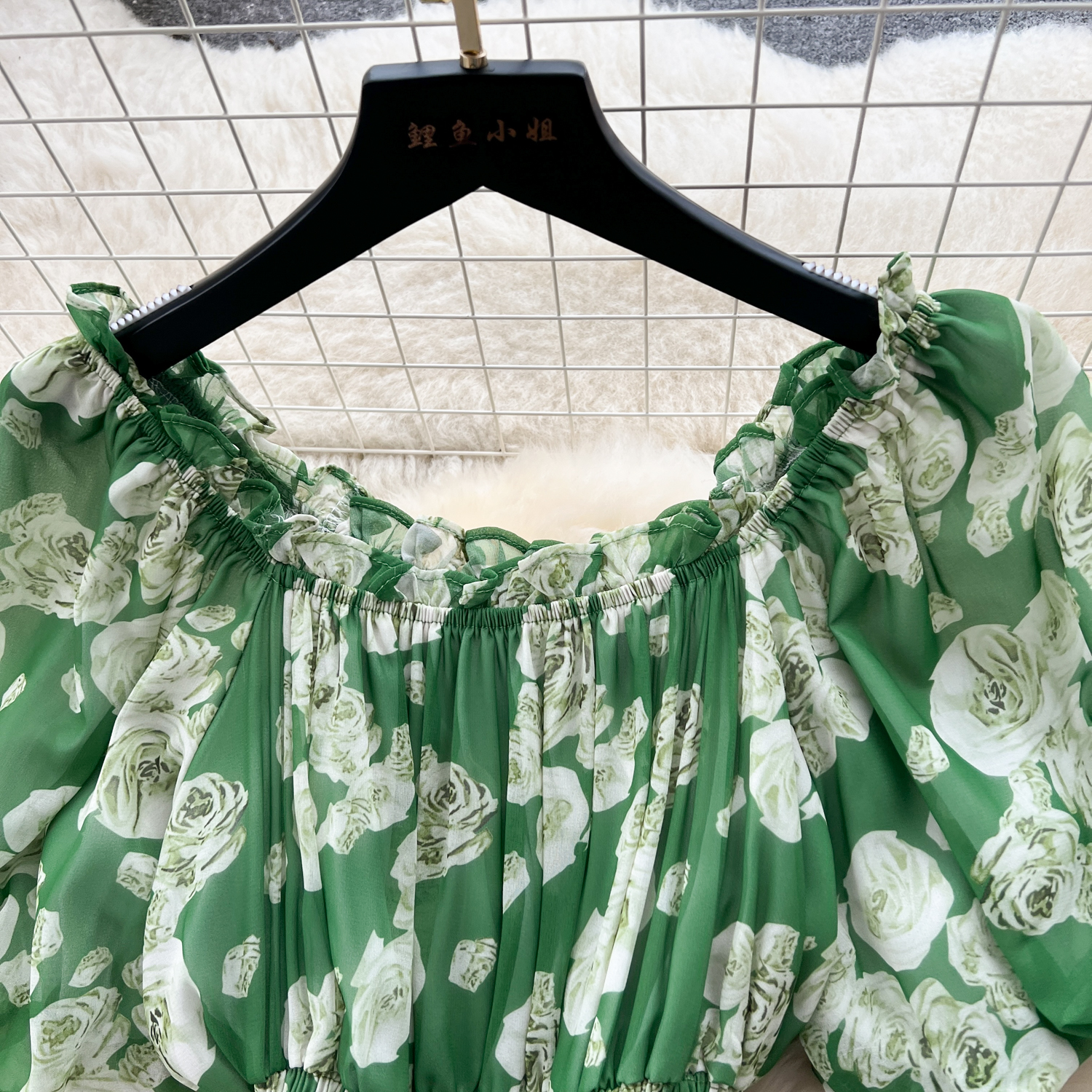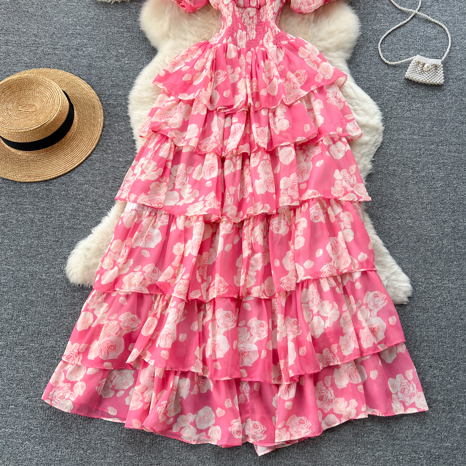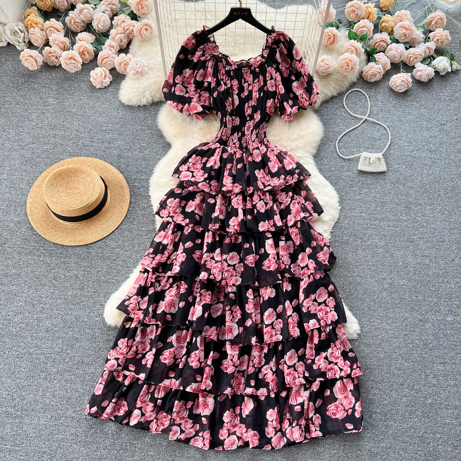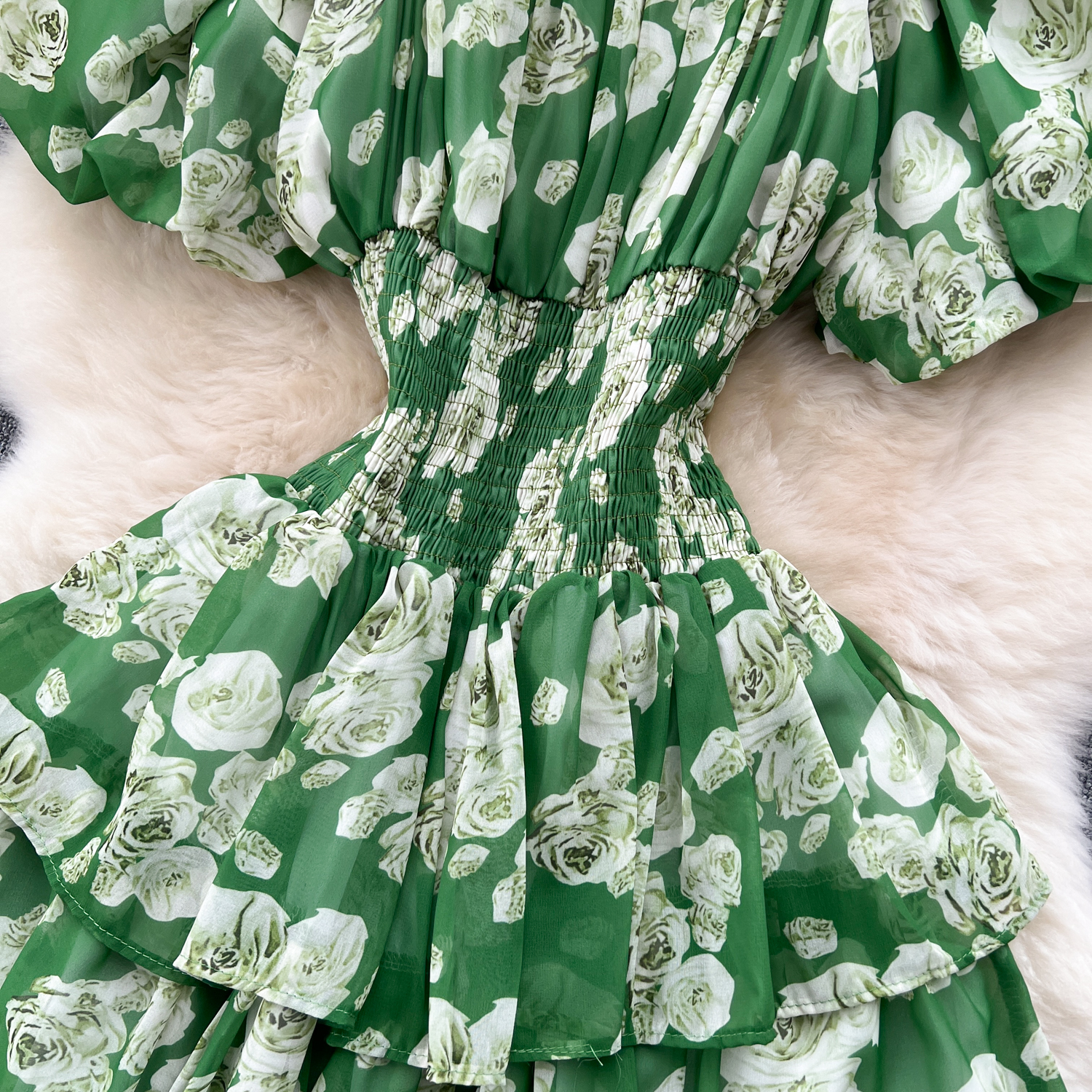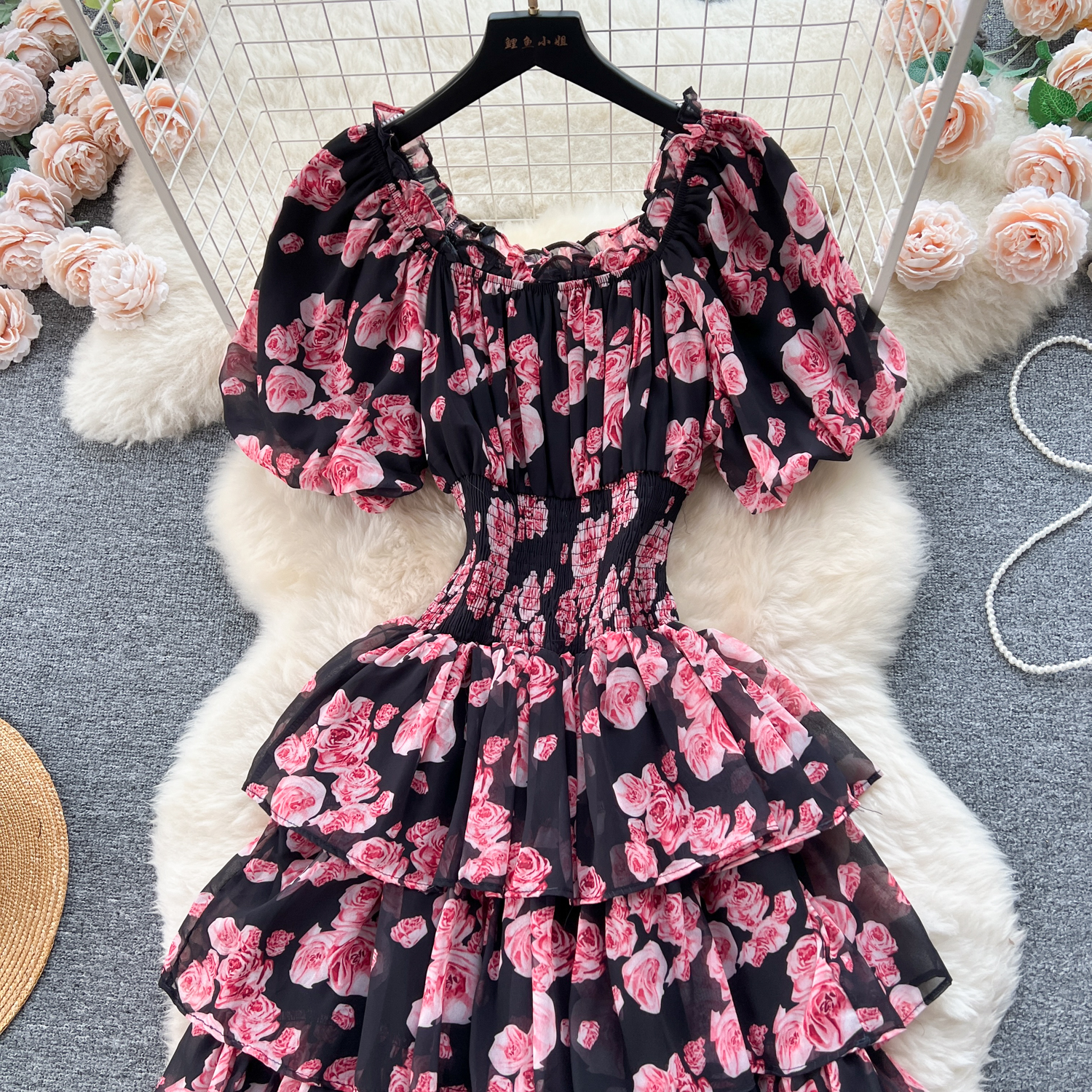 フランスのレトロで優しい風のシワの花のワンピース
