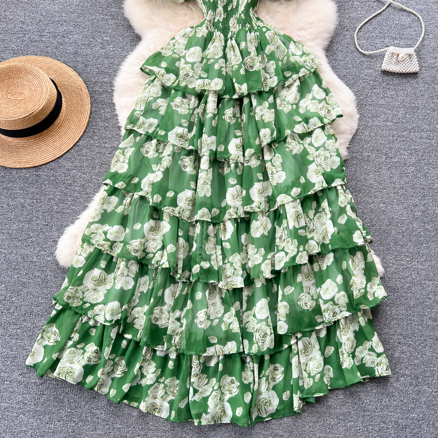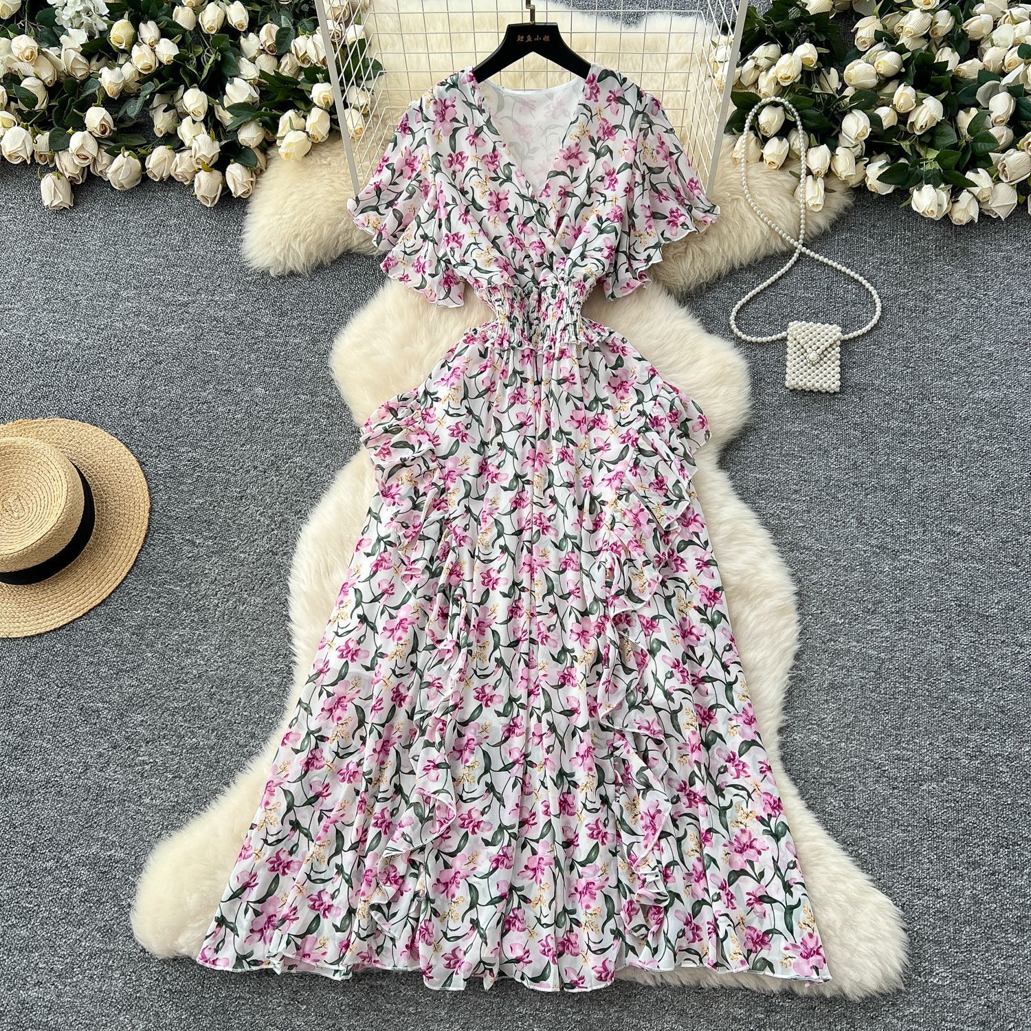 法式高端气质连衣裙女夏季高级感收腰不规则荷叶边碎花雪纺长裙子