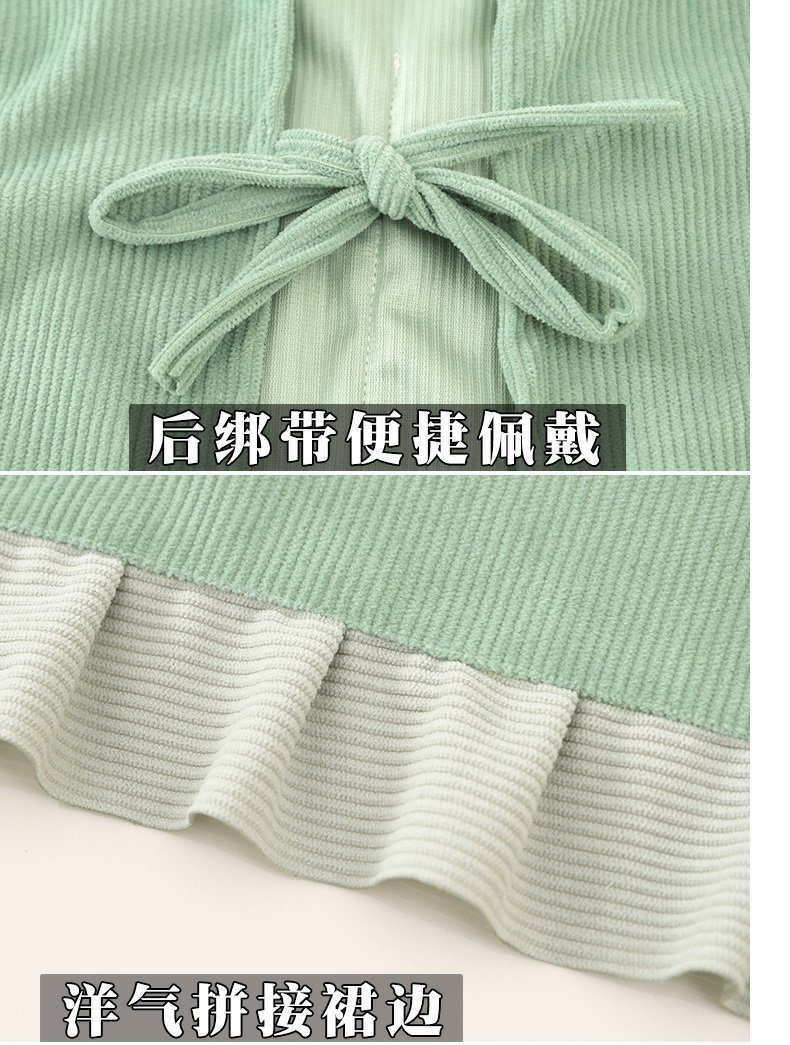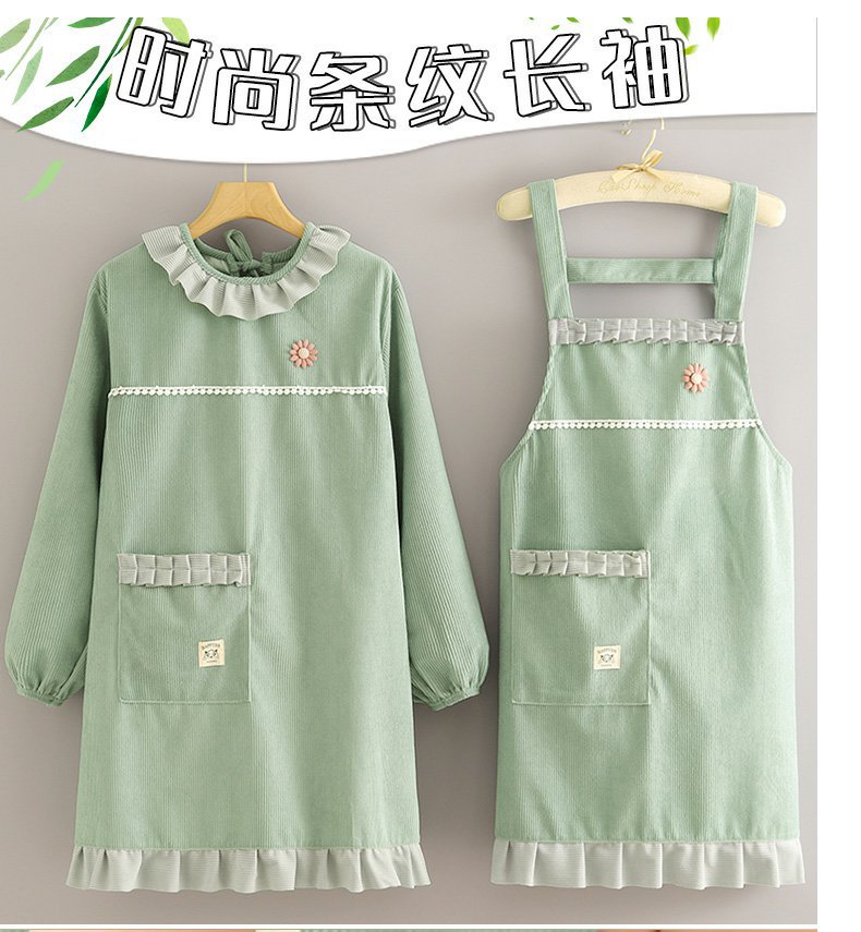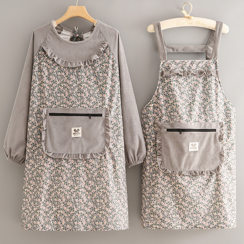 家庭用キッチン用のスタイリッシュな韓国風コーデュロイ長袖エプロン、かわいい防汚調理用高級つなぎ服