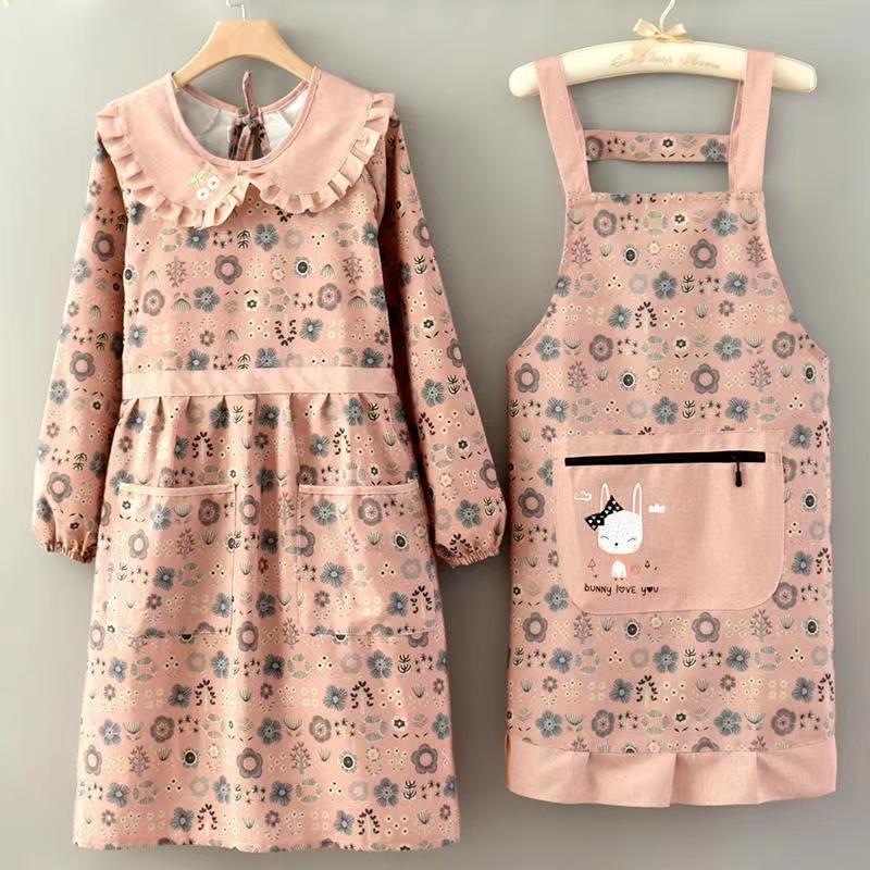 韓国版綿布カバー女性新型通気性長袖エプロンキッチン家庭用防汚耐汚れ作業服大人用ウエスト