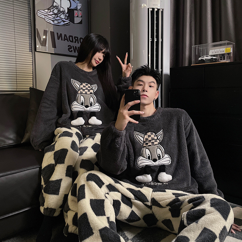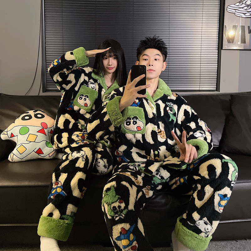 秋冬のサンゴのベルベットのカップルのパジャマの女性のベルベットは、漫画の男性の新しいフランネルの冬のホームウェアを厚くします