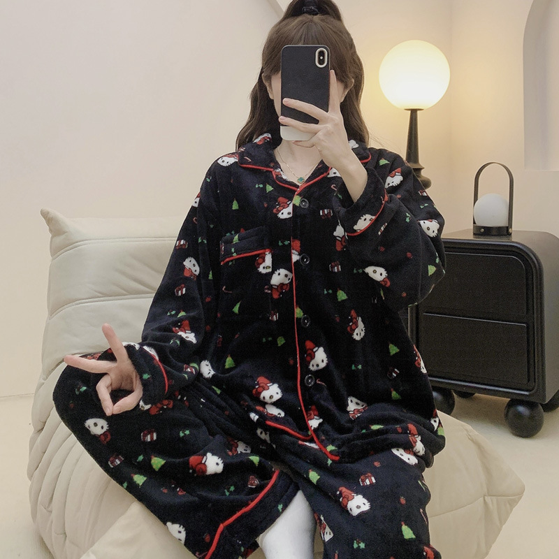 アニメパジャマの女性は冬に襟をひっくり返して新しい学生を厚くしてかわいいkt猫フランネル2024セットの部屋服を着ている