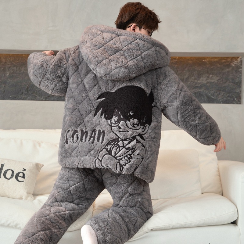 三层夹棉珊瑚绒睡衣男冬季加厚加绒柯南大童青少年棉袄家居服套装
