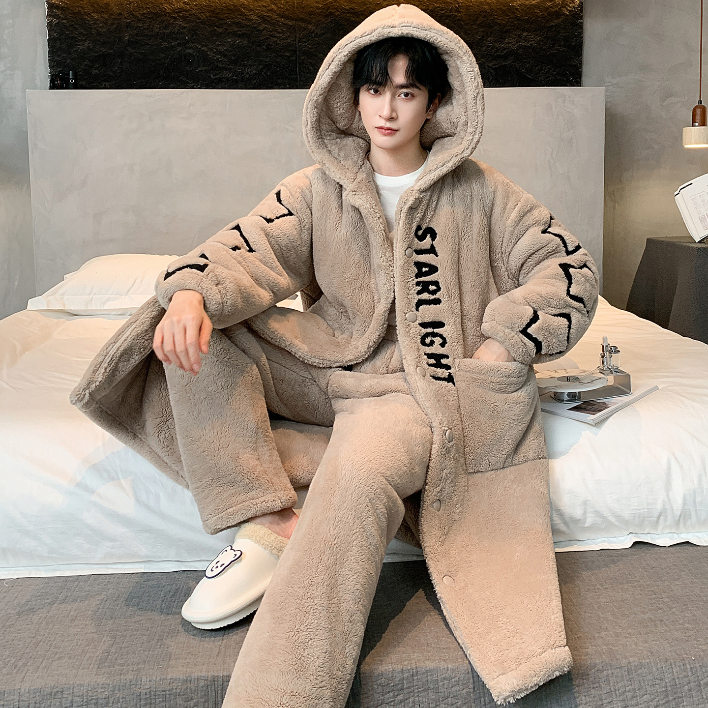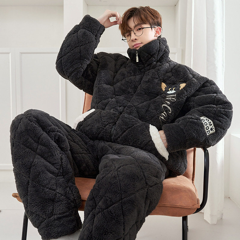 秋冬季男士睡衣加绒加厚三层夹棉男款珊瑚绒冬季青少年法兰绒套装