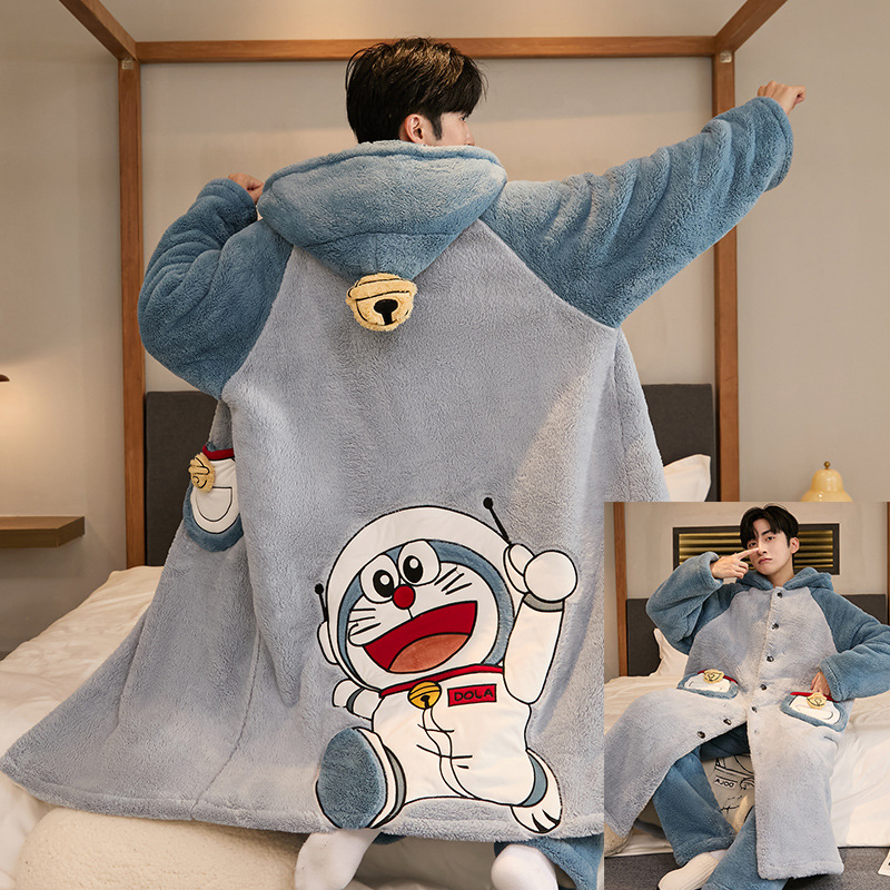 卡通叮当猫睡袍睡衣青少年男士珊瑚绒秋冬加肥加大码加绒加厚套装