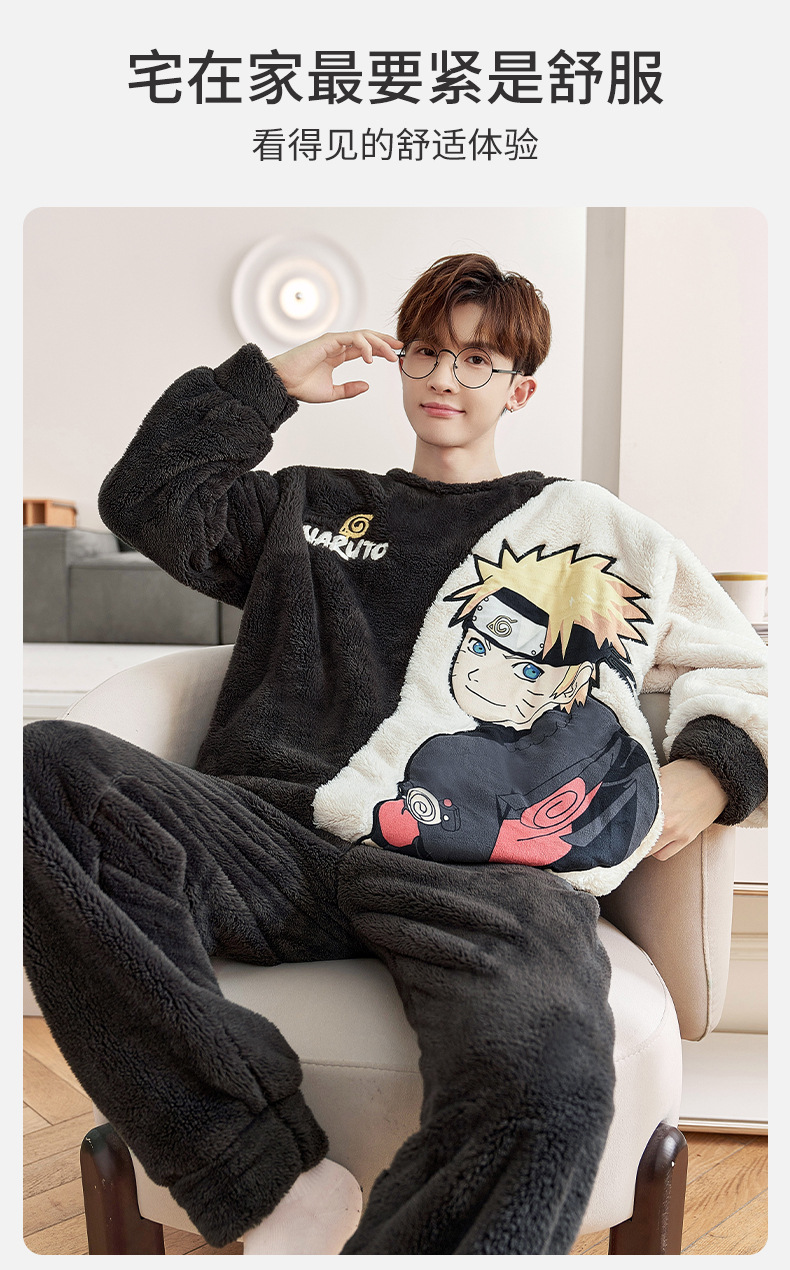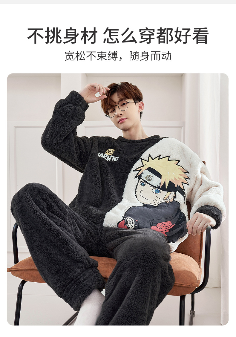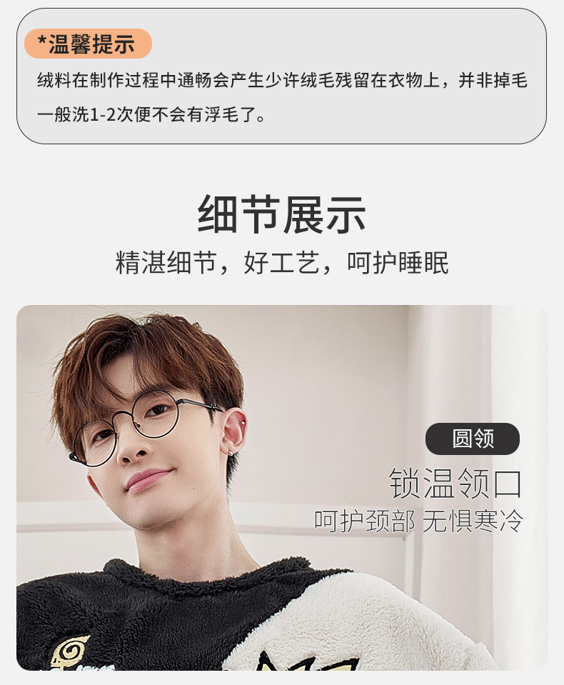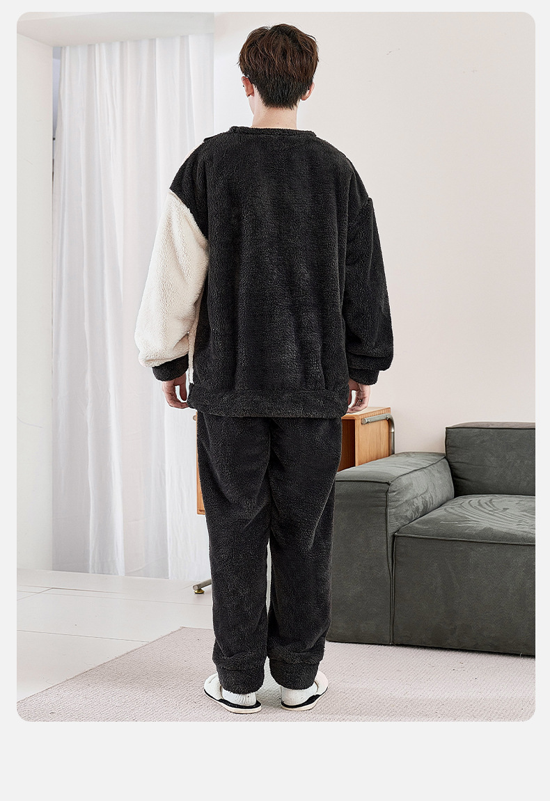 严选男士珊瑚绒套头睡衣秋冬季加厚加绒长袖法兰绒帅气家居服套装