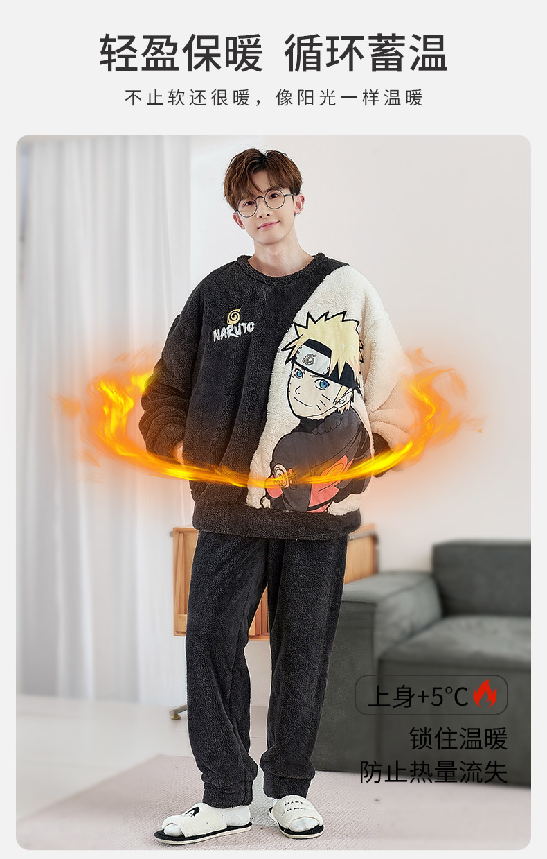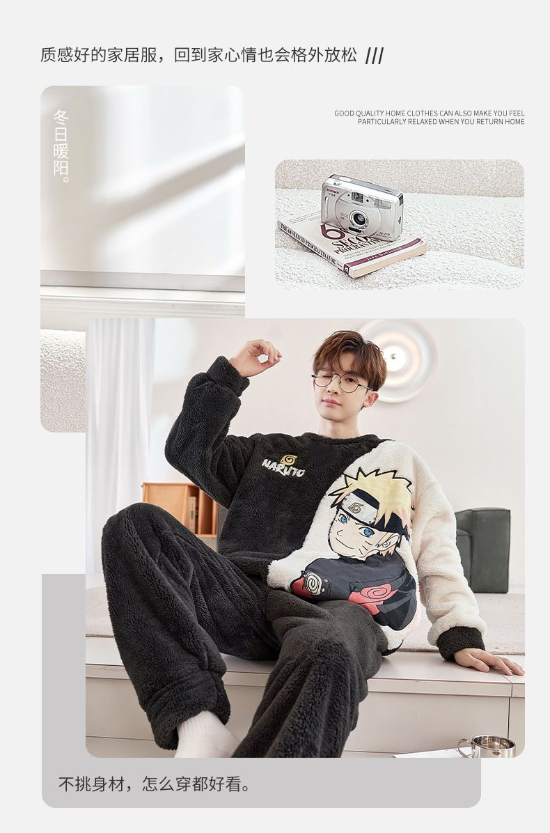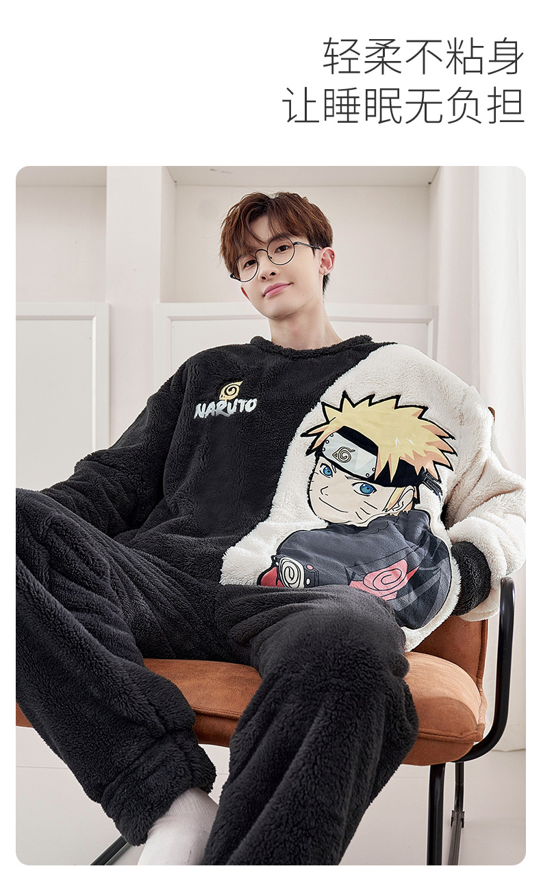 严选男士珊瑚绒套头睡衣秋冬季加厚加绒长袖法兰绒帅气家居服套装