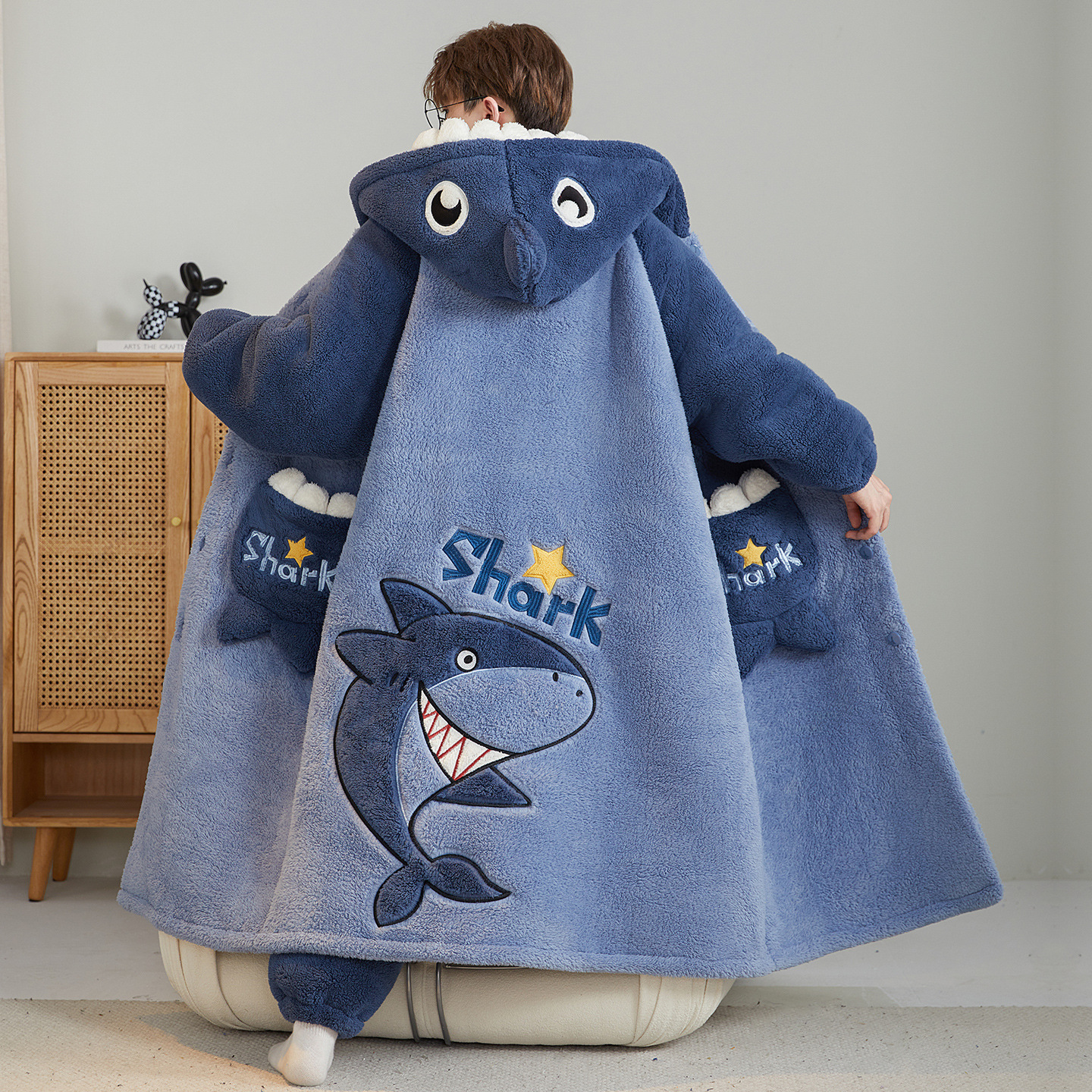 珊瑚绒睡袍男款冬季加绒保暖加厚长款家居服连帽大码可外穿法兰绒