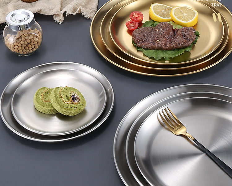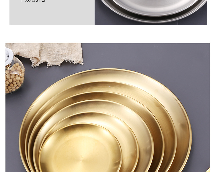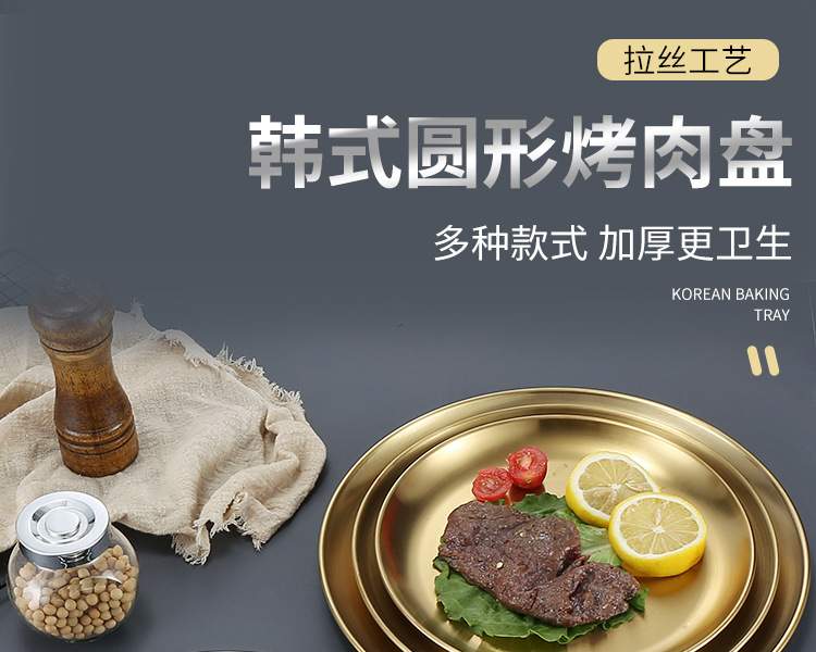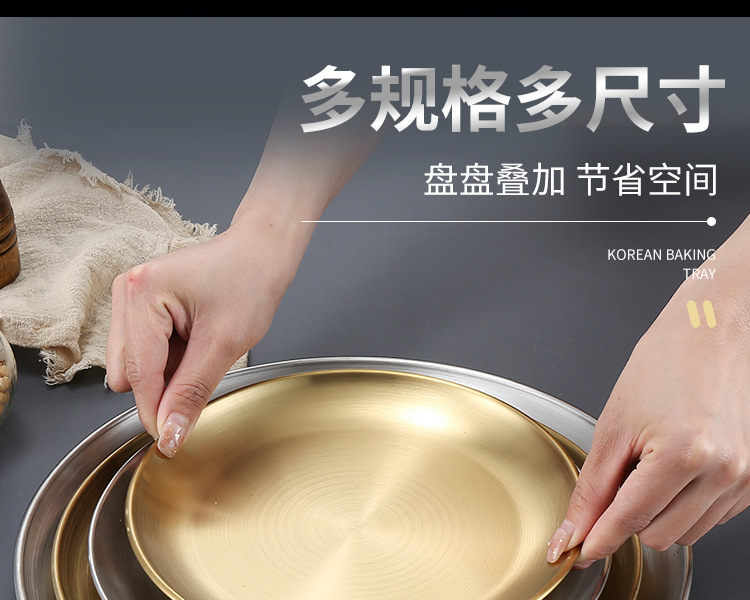 韓国式焼肉皿304ステンレス円盤厚い金色のトレーのフラット皿家庭用スナック皿円形皿