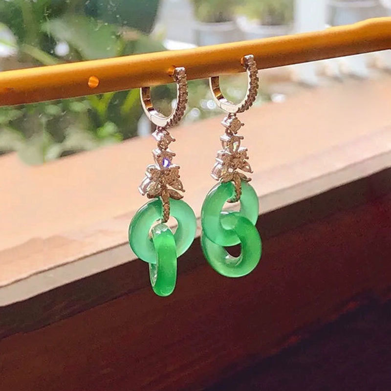 雪花双環平安ボタンピアス高級メッキ925純銀リングバックルグリーン双環ボタンイヤリング