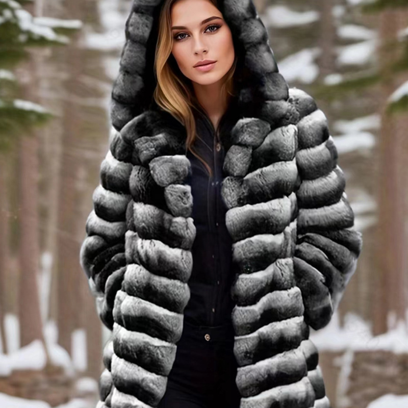 クロスボーダー秋冬新作模造毛皮フード付きコート模造毛皮コートシマウマ柄レディースミディアムロング保温コート