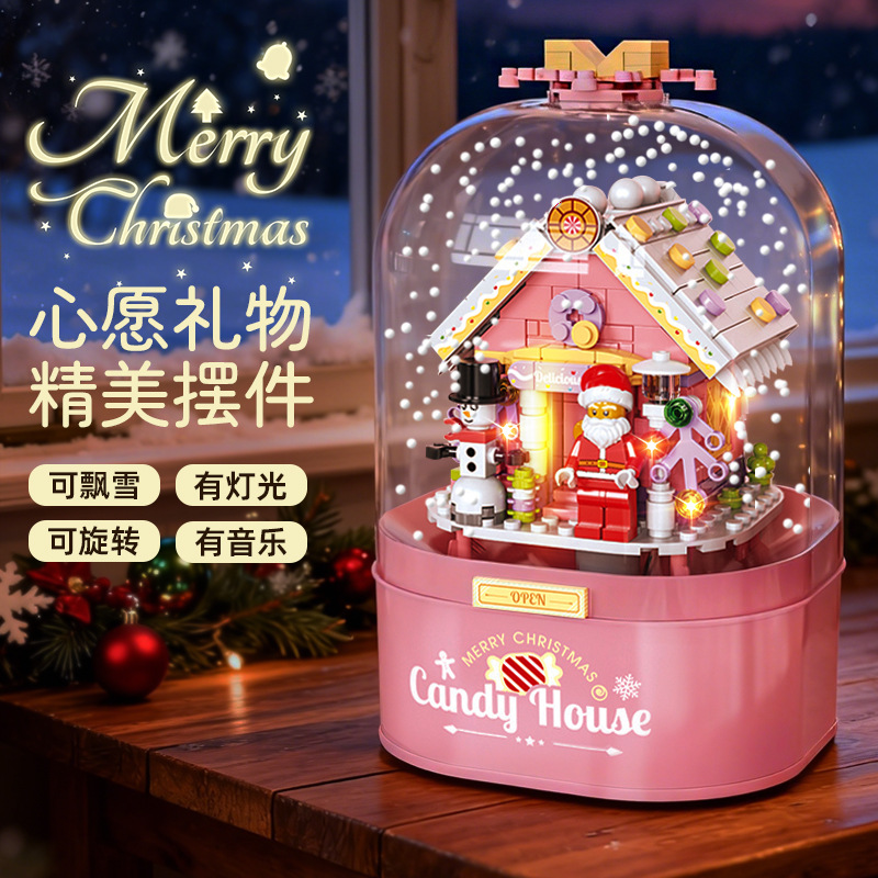 钻牌Z020粉色糖果屋圣诞飘雪音乐盒摆件拼装圣诞积木玩具礼物