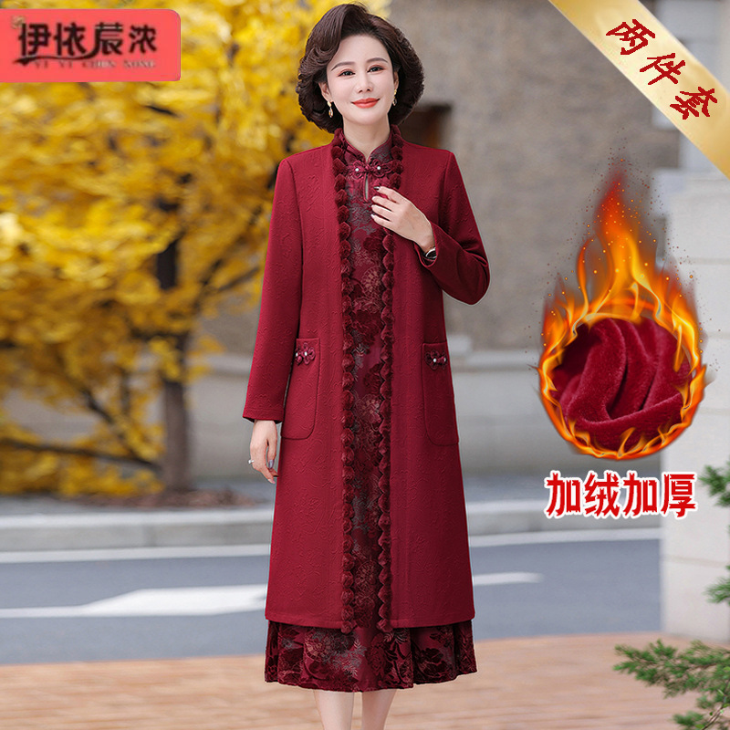 お母さんの赤いワンピースセットとベルベットの厚いコートのワンピースセットの新しいおばあちゃんの披露宴セットのスカート