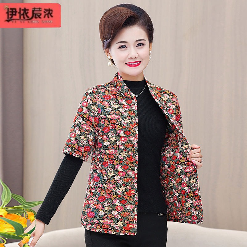 中高年のお母さんはベストの綿服のコートを着ます。