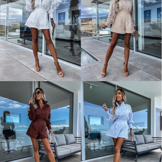 欧米2024新商品気質女装カジュアルファッション純色レース多ボタンセット長袖上着半ズボン