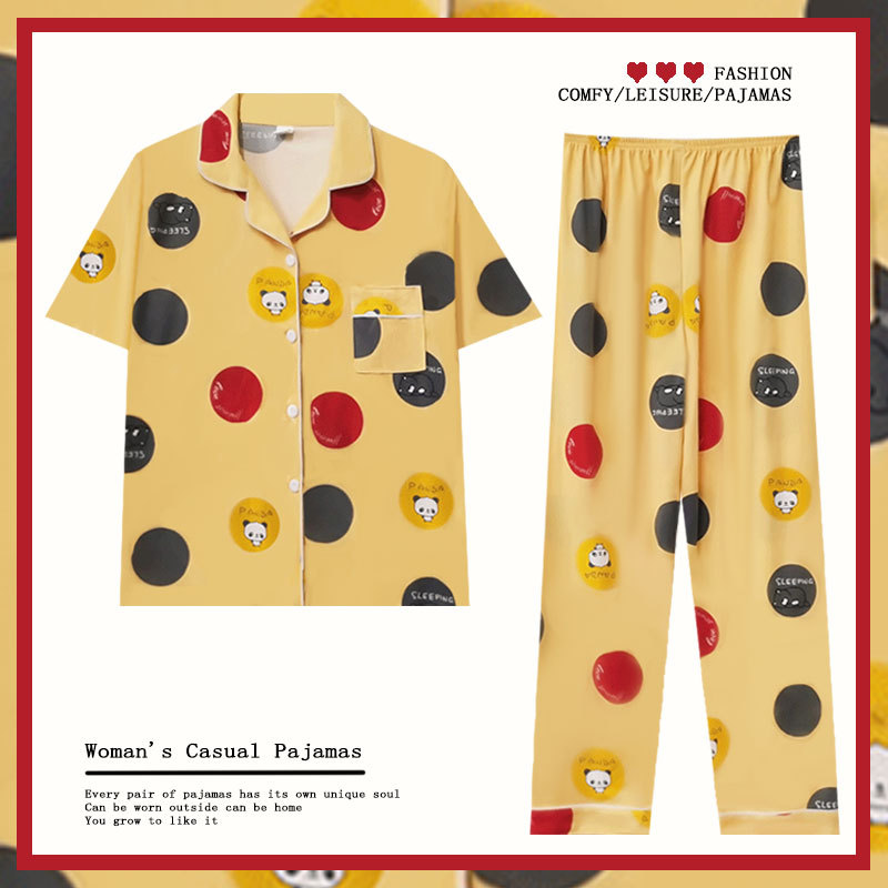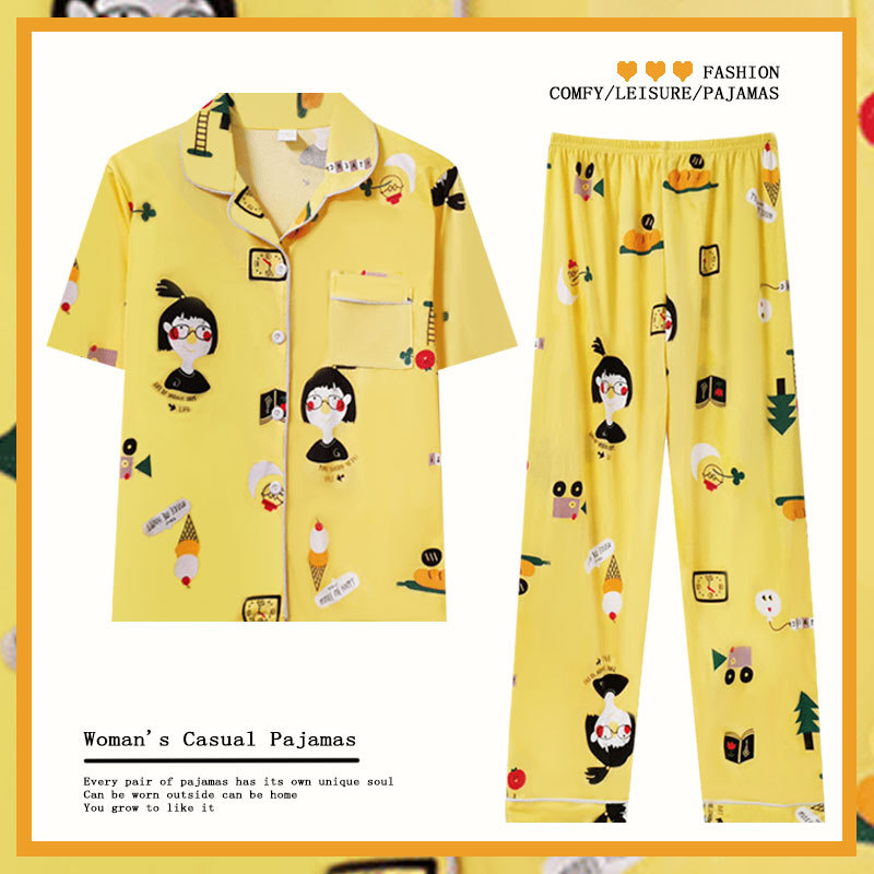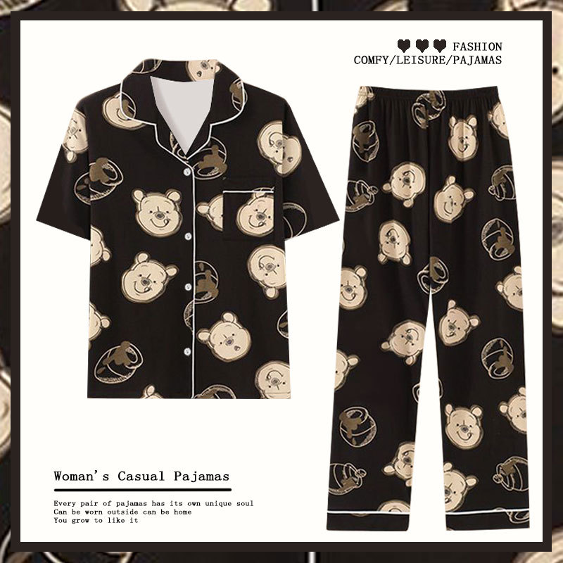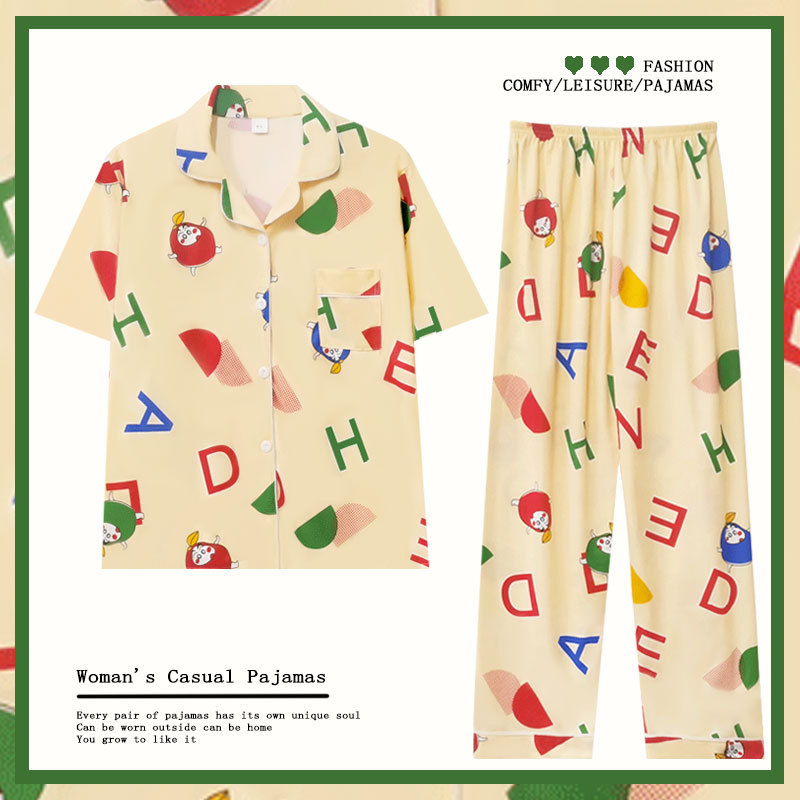 海外直販 パジャマ レディース 春秋 襟付き 長袖 カーディガン ゆったり 可愛い 漫画柄 学生風 インス風 ホームウェア セット