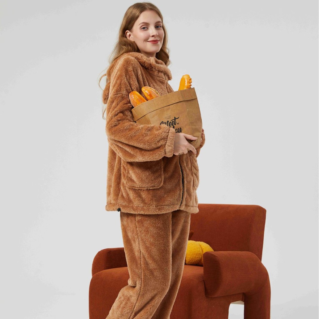 秋冬季美拉德系小熊立领连帽睡衣女冬加绒女套装睡衣可外穿家居服