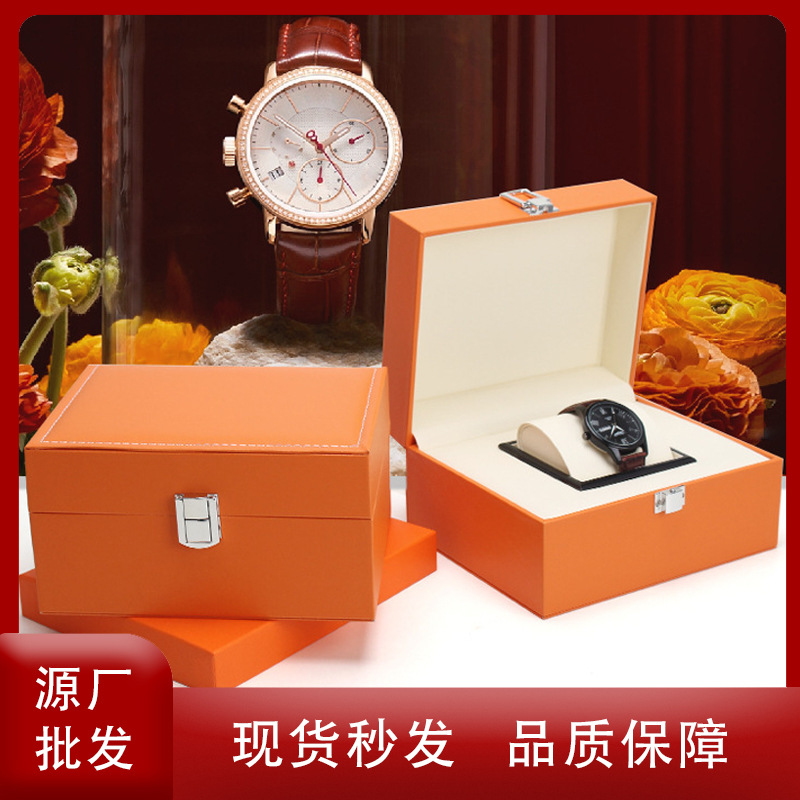 美しい収納ケース高級皮質男女腕時計ケース金属ボタン付き腕時計プレゼント包装ギフトボックスオレンジ色紙