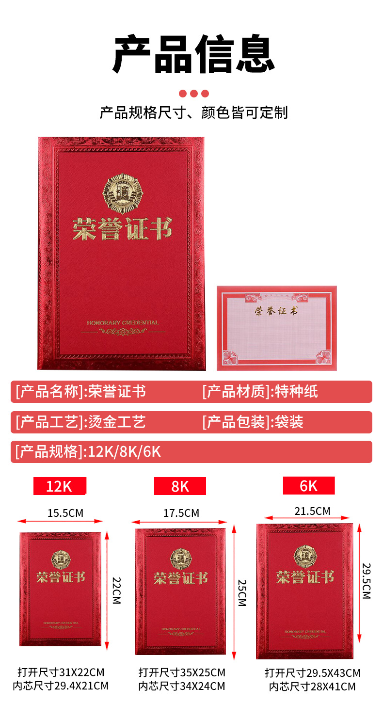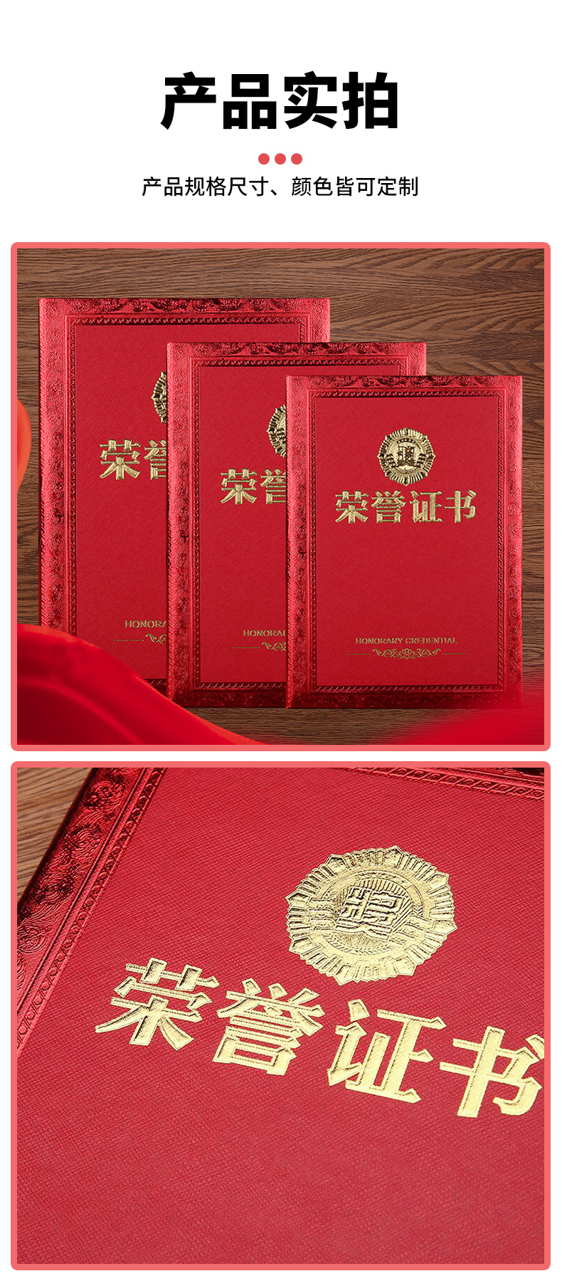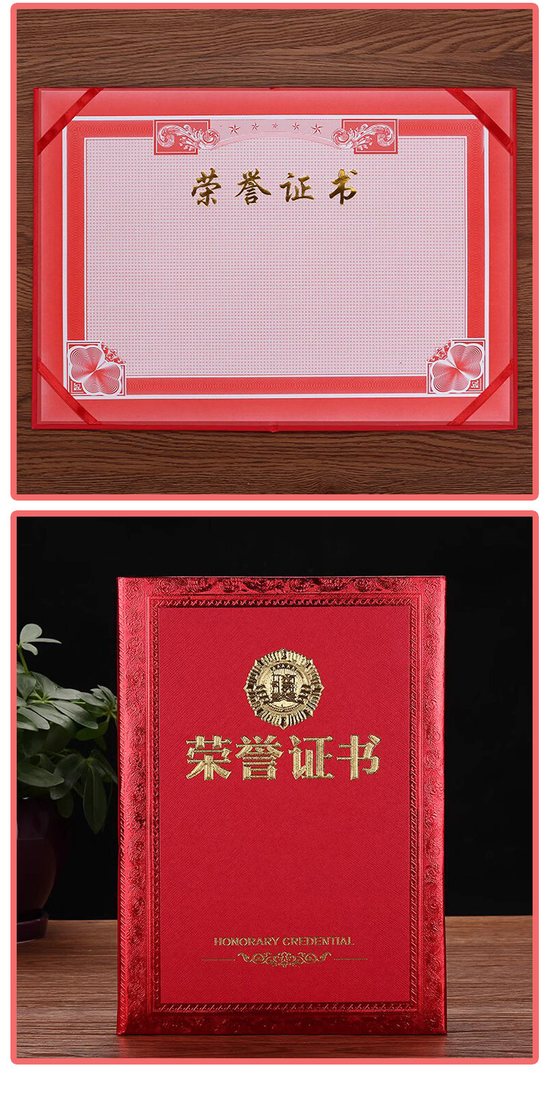 名誉証明書、金箔押し立体印刷、バラ模様の縁取り証明書カバー、内側に証明書が入る、卒業式用の赤い証明書封筒