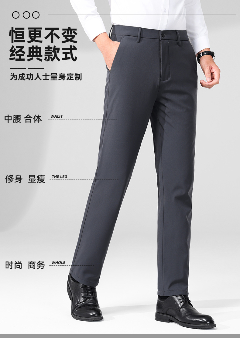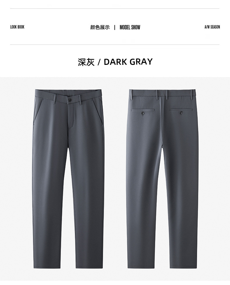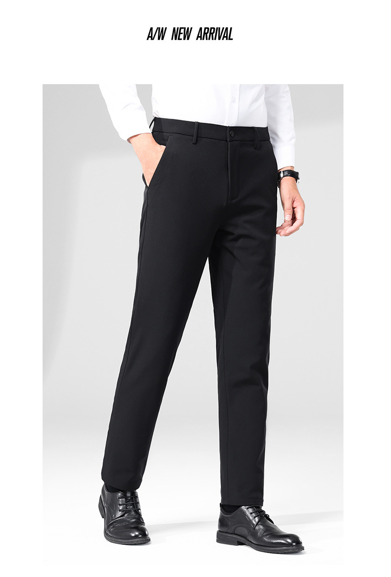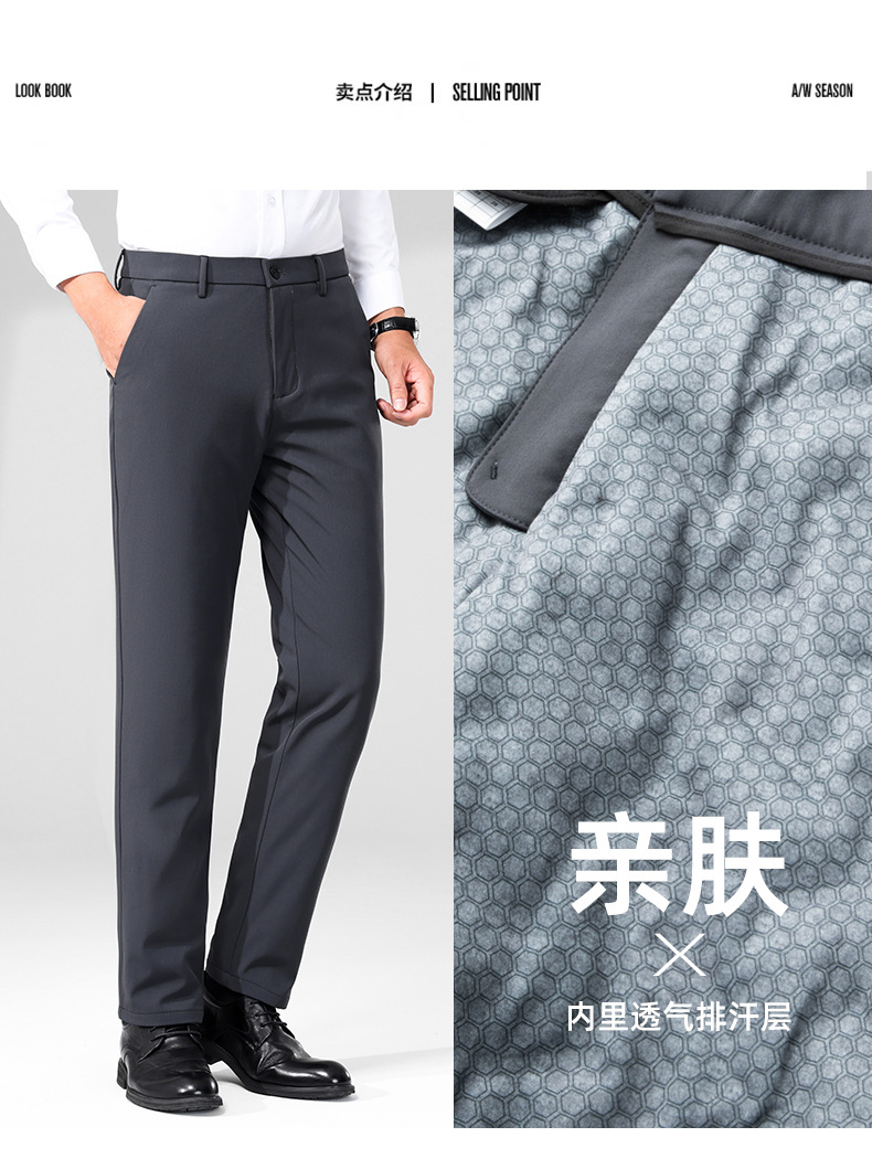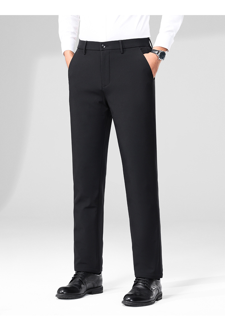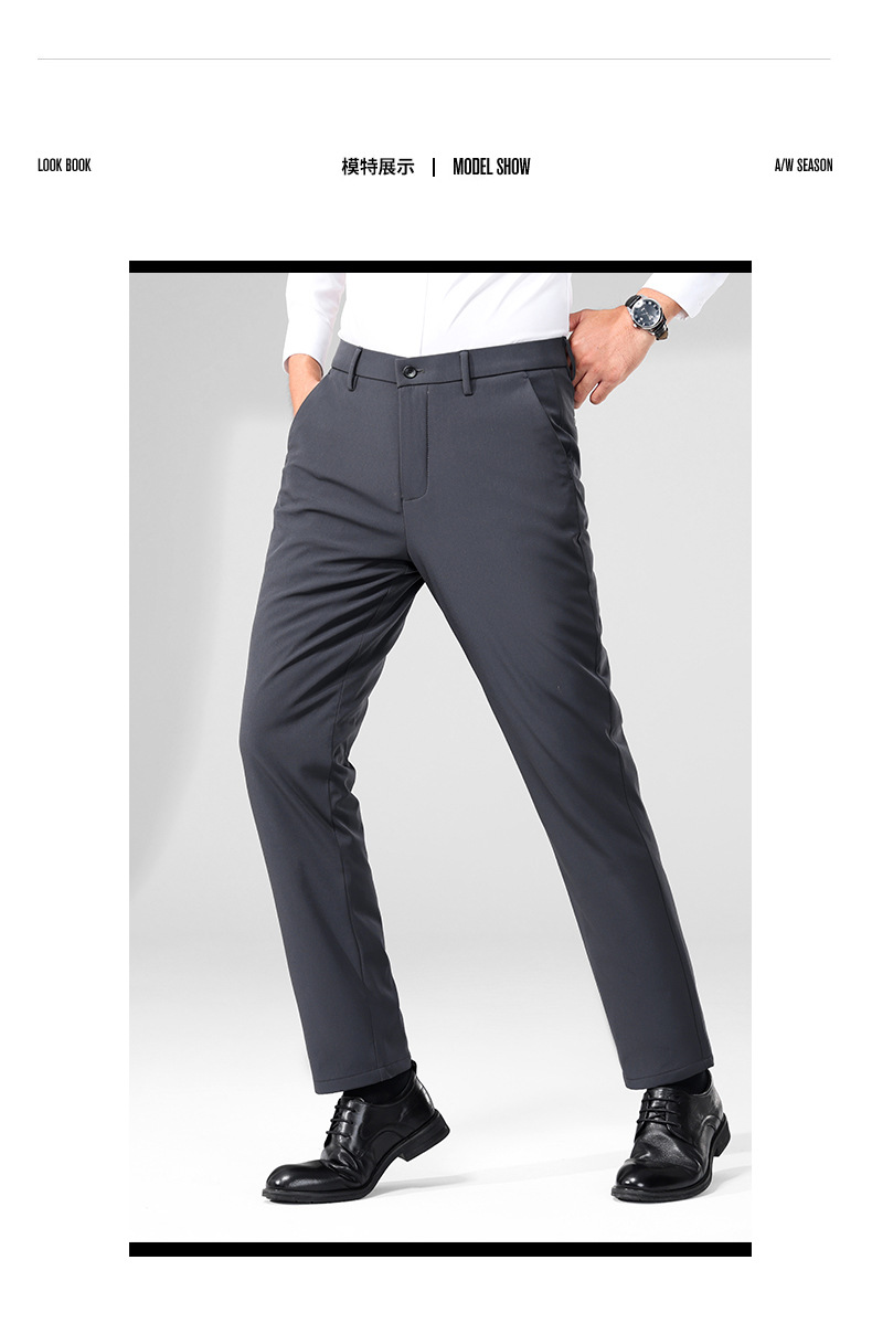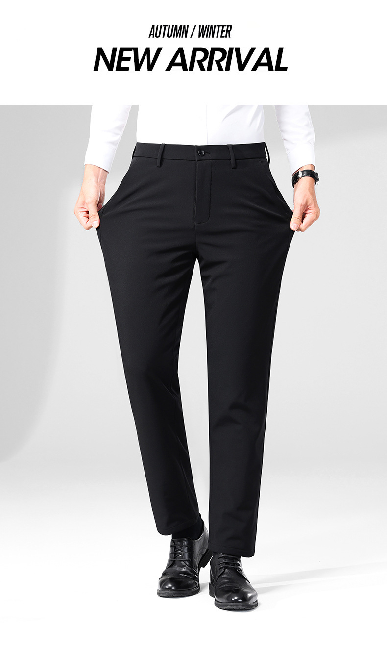 秋冬用ミルクシルク厚手カジュアルメンズパンツ、三防加工、裏起毛、メンズストレート、高伸縮性、防シワ、ドレープ感のあるビジネススーツパンツ