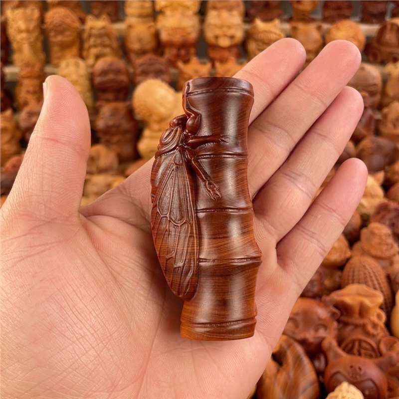 天然モミ無垢材彫刻、高油古材、驚異の手持ち品、文具、段々と上昇する金蝉と蝉の置物