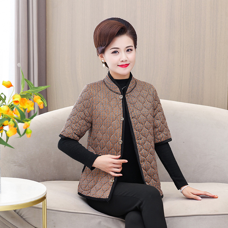 中高年の羊のキャメルケースの綿入れの上着の女性とベルベットの厚いレトロな花の肌着の小さい綿服の綿服の保温のお母さんのコート