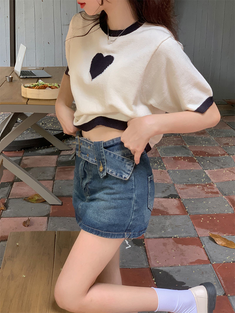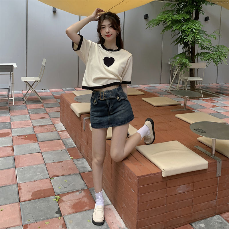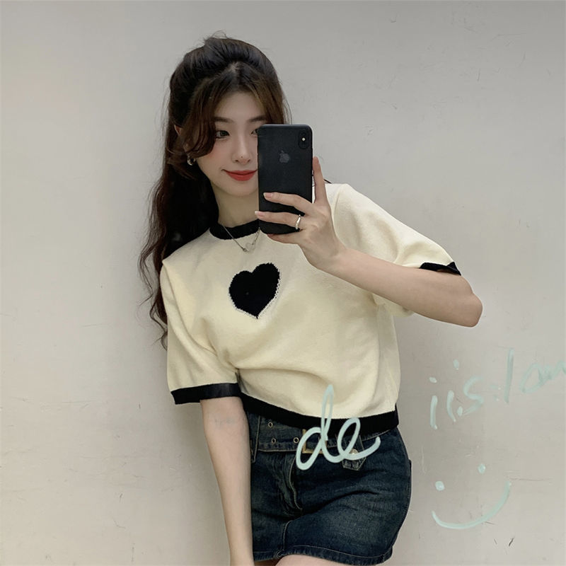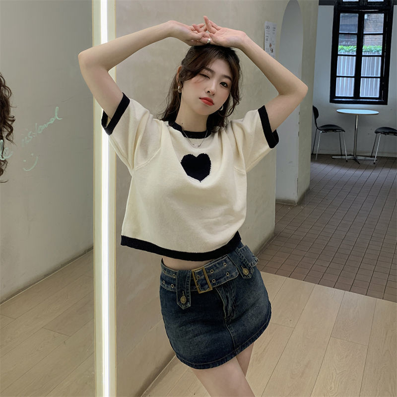 デザイン感衝突色愛正肩tシャツ女性夏2023新甘辛い短いアイスニット半袖上着