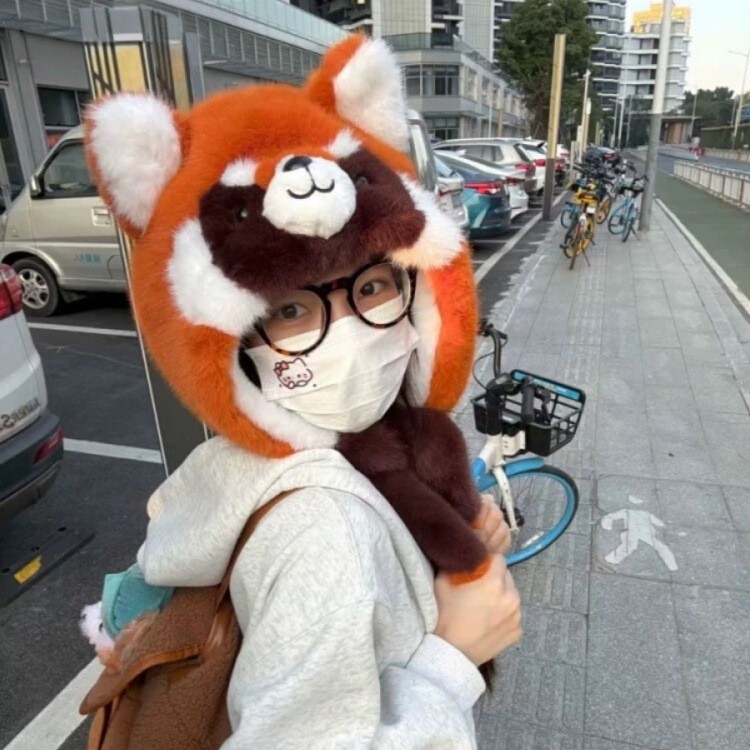 小浣熊护耳雷锋帽捏耳朵可动可爱小熊猫毛绒帽子女冬天保暖套头帽