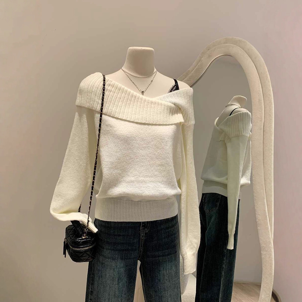 纯欲秋冬新款斜肩高级设计感拼接长袖针织衫女假两件显瘦内搭上衣