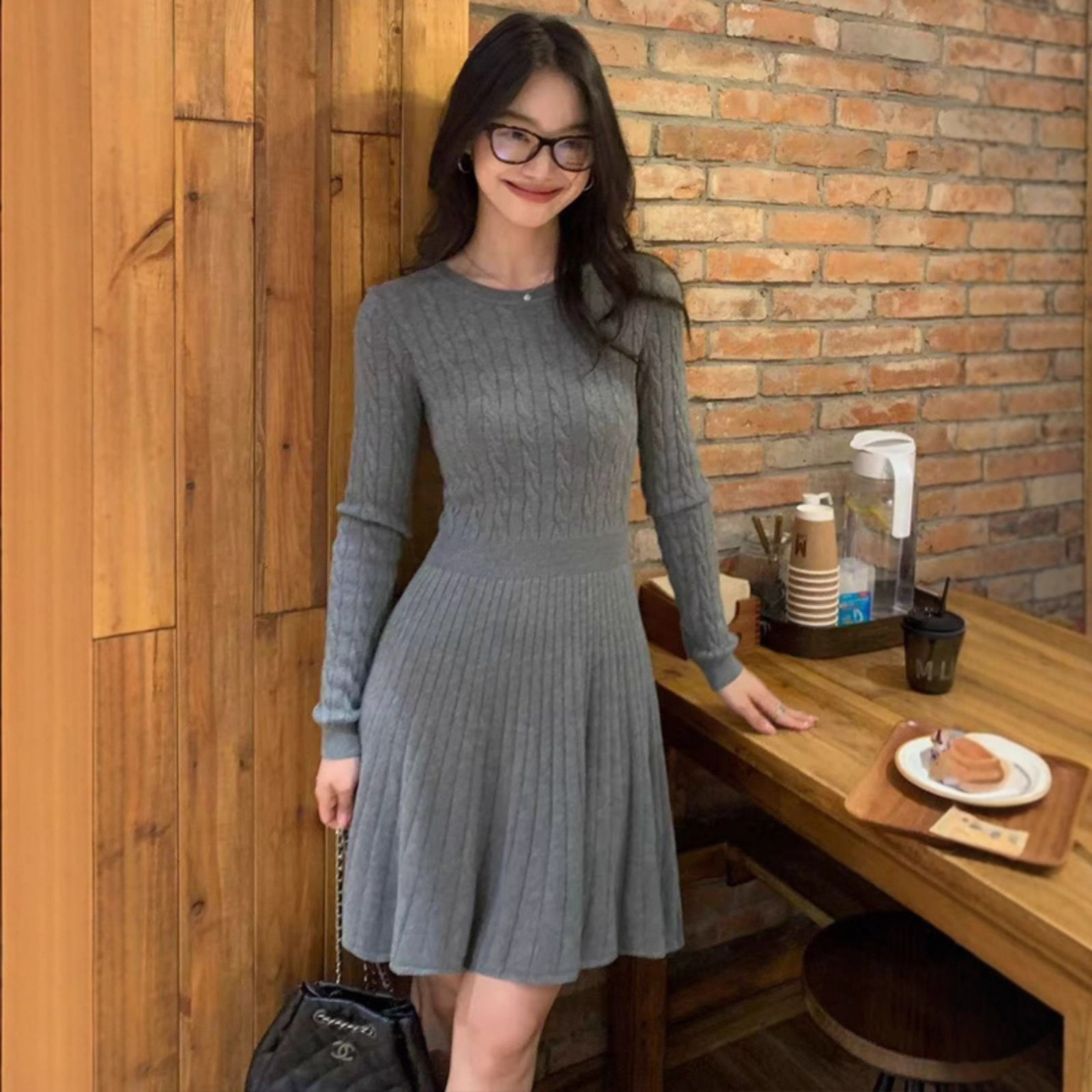 欧洲站法式气质长袖针织连衣裙秋冬收腰显瘦a字圆领打底裙短裙子