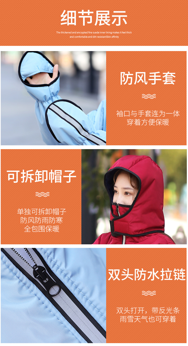 秋冬の電気自動車の防風は薄い絨毛に厚くされて、防風服に乗ります。防寒神器防風は防水保温装備されます。