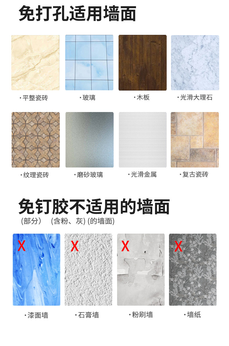 (2)安装请注意,安装前请看视频,墙面需平整坚固的玻璃瓷砖等。不可用在粉刷墙,墙纸,石灰墙等不平整不坚固的墙面上。涂胶上墙后需等待3-5天,免钉胶完全干透再使用!