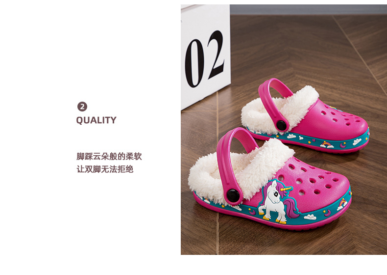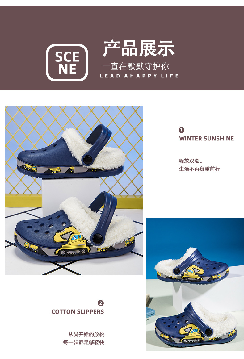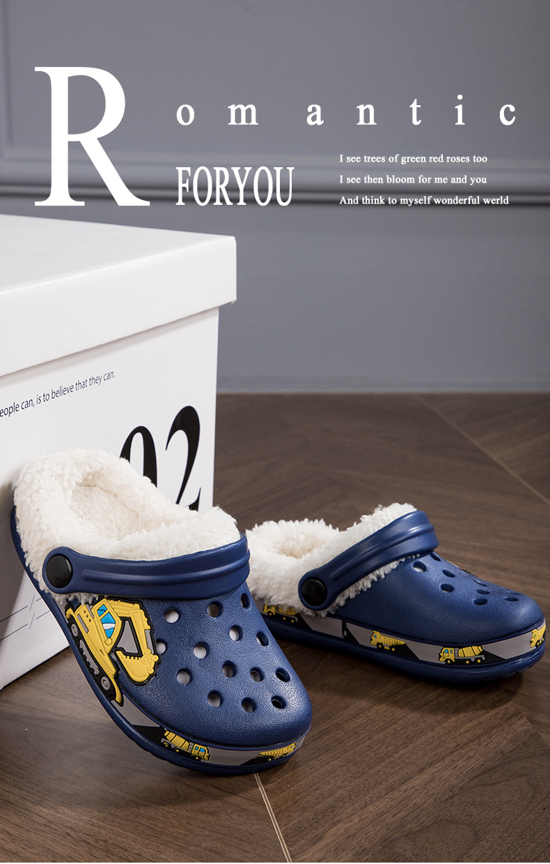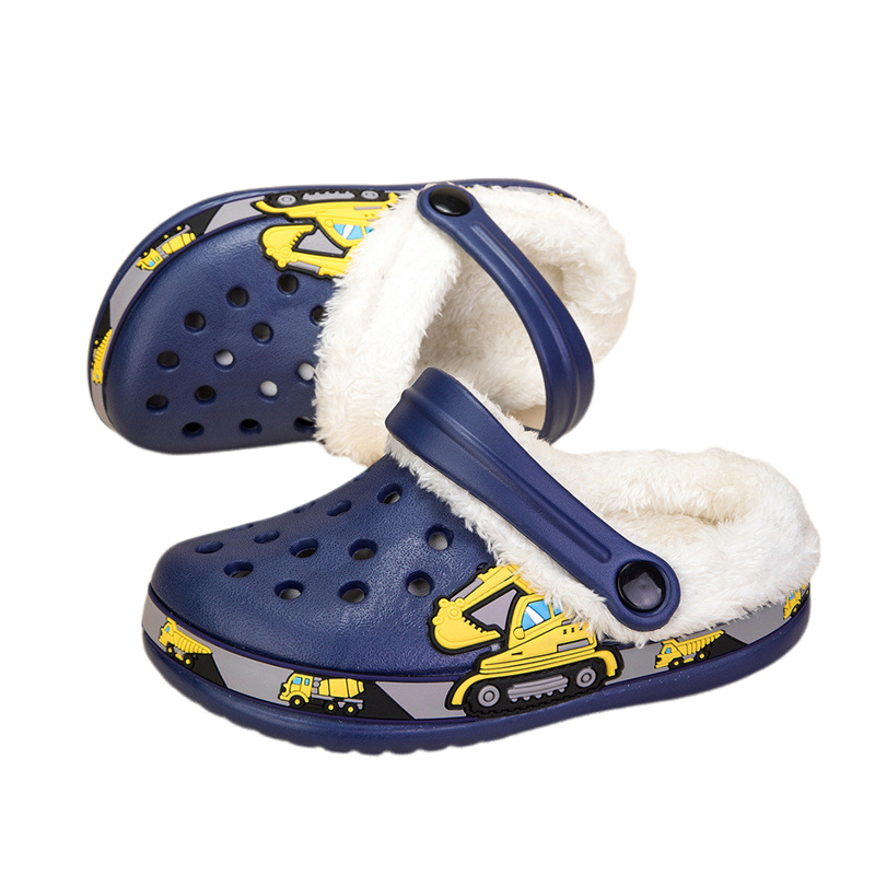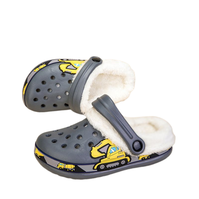 国境を越えた子供用裏起毛穴あきシューズ卸売、男の子と女の子向け、取り外し可能な可愛い漫画の掘削機柄、厚手の綿スリッパ