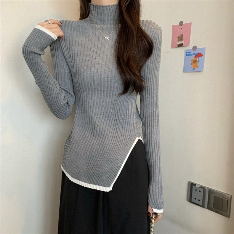 高級感のあるセーターの洋風は色のメリヤスの底のシャツの女性の秋冬の中で不規則なフォークの半分の高さの中で上着を着ます。