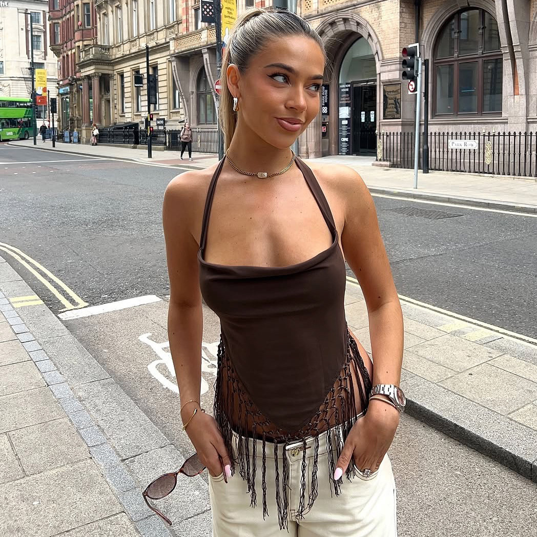 ヨーロッパとアメリカの女性の服 2025 夏の新しい女性のデザインタッセルセクシーなバックレスソリッドカラーホルターネックキャミソール女性