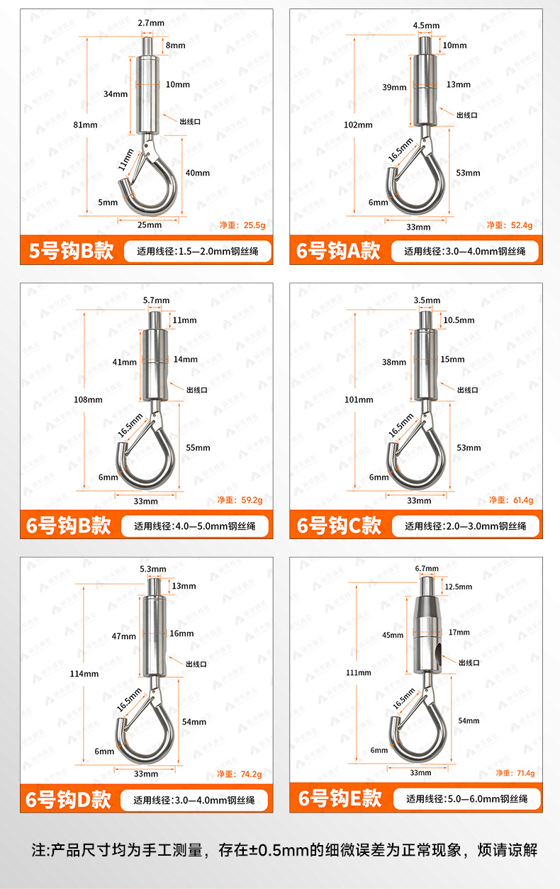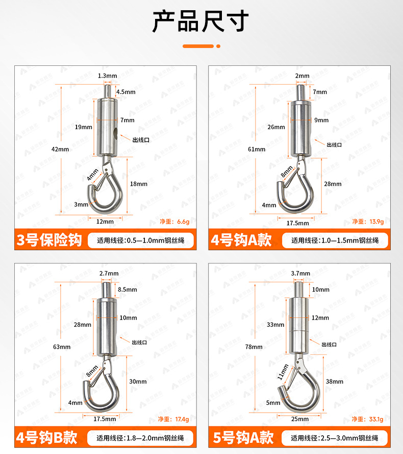 製品仕様 No.3安全フック(0.5~1.0mmワイヤー通し),4号フックA型(1.0~1.5mmワイヤー通し),4号フックB型(1.8~2.0mmワイヤー通し),5号フックA型(2.5~3.0mmワイヤー通し),5号フックB型(1.5~2.0mmワイヤー通し),6号フックタイプA(3.0~4.0mmワイヤー通し),6号フックタイプB(4.0~5.0mmワイヤー通し),6号フックタイプC(2.0~3.0mmワイヤー通し),6号フックDタイプ(3.0~4.0mmワイヤー通し),6号フックEタイプ(5.0~6.0mmワイヤー通し)