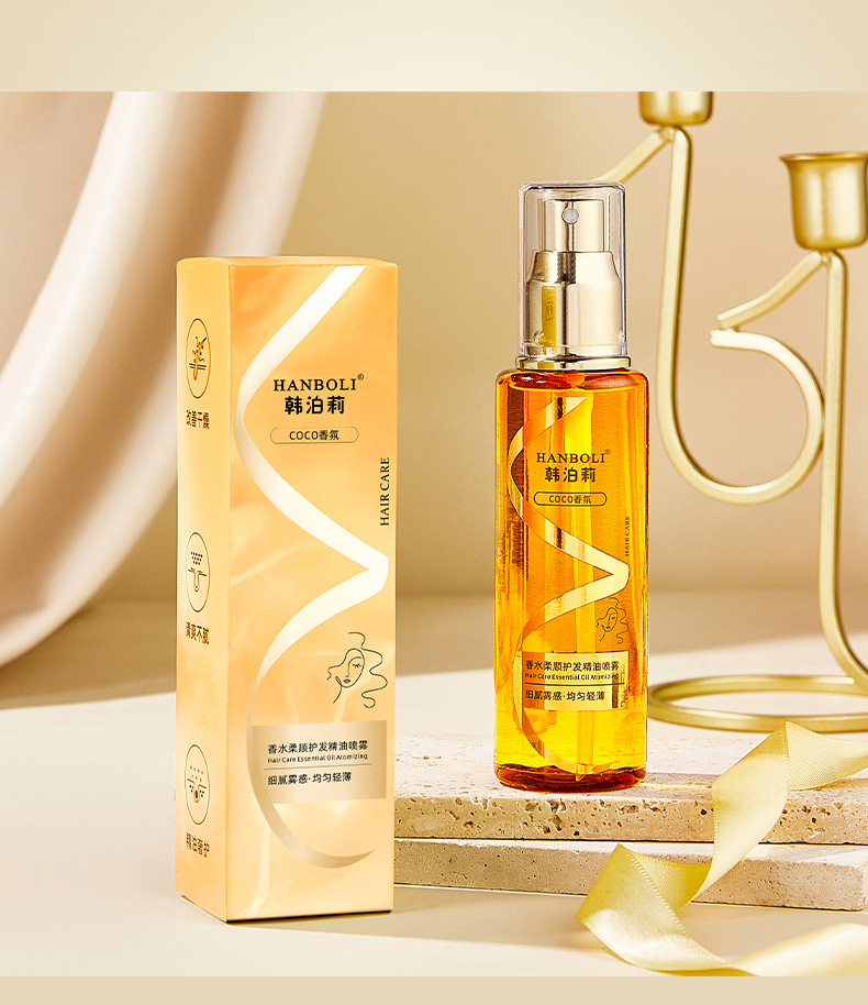 Hanpolli の軽くて光沢のあるヘアケア スプレーは、乾燥や縮れを防ぎ、さわやかでベタつかず、香りが良く、滑らかなヘアケア エッセンシャル オイル ヘアオイルです。