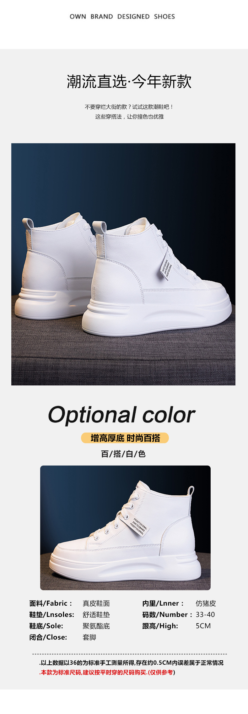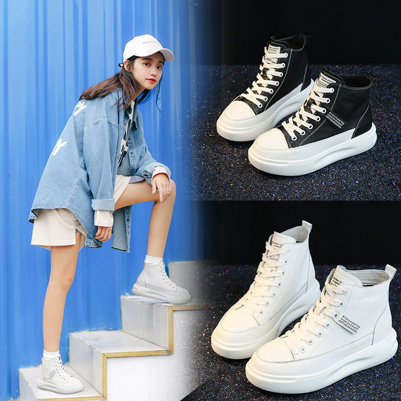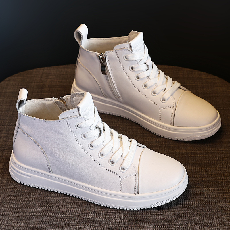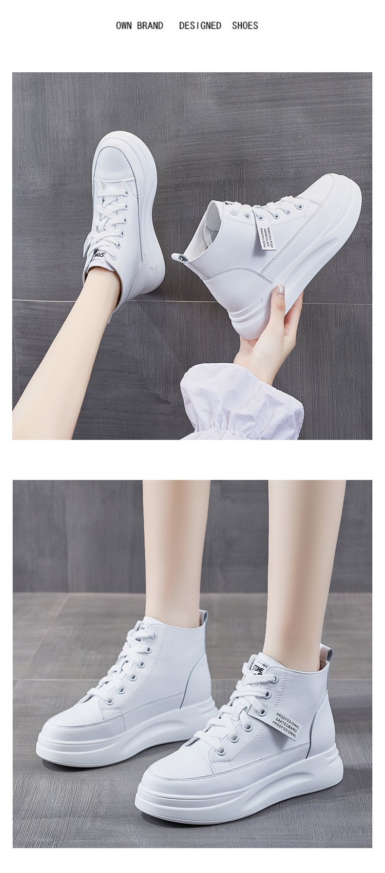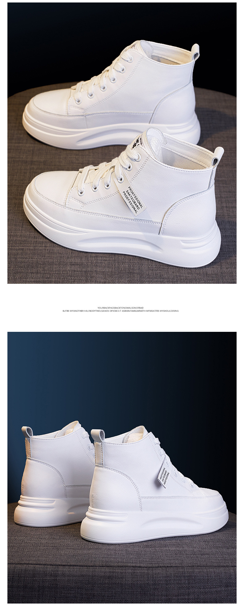 本革厚底ハイトップ白靴女性用 2025 春の新作厚底韓国風シングルシューズ平底多用途女性スニーカー