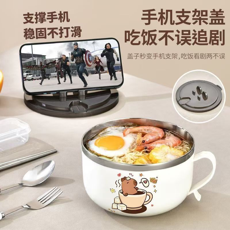 無言猫泡麺ボウル304ステンレス大容量水切りカバー付きかわいいins風学生女子食堂弁当箱