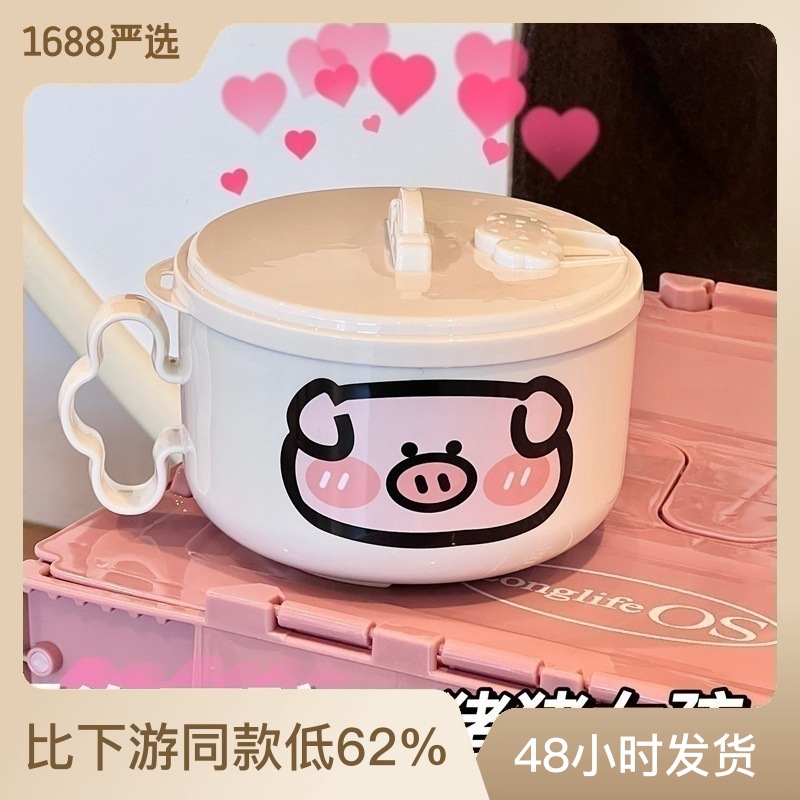 新款粉猫304不锈钢可沥水泡面碗带盖学生宿舍饭碗ins风折叠餐具
