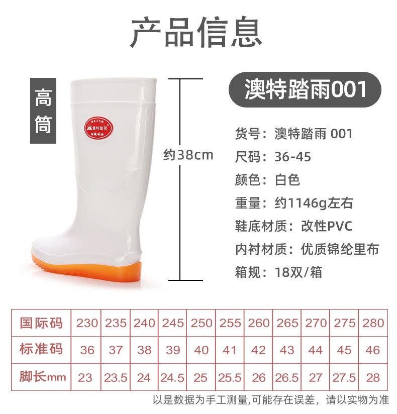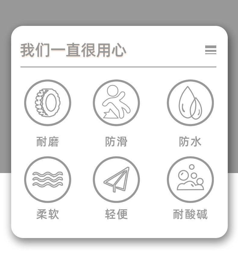 我公司为国内专业雨鞋生产厂家,月产量100万双,厂房面积超2万平方。公司成立以来,一直秉承“诚信、专业”的经营理念,坚持用户至上的宗旨,拥有完整、科学的质量管理体系,通过了ISO9001质量管理体系认证,ISO14001:2015环境体系认证,公司的诚信、实力和产品质量获得业界的认可,欢迎各界朋友莅临参观、指导和业务洽谈。
